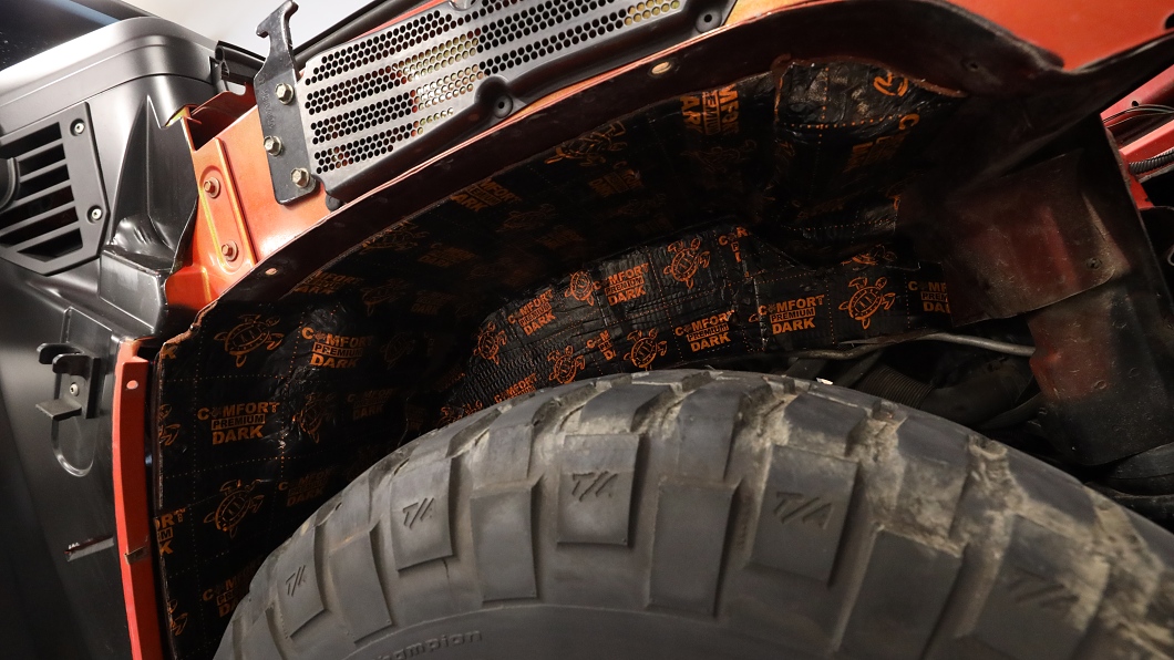 Odhlučnenie predných podbehov dokáže účinne zmierniť prenikanie hluku do interiéru vozidla od predných kolies a cesty. Zároveň zamedzí hluku od lietajúcich kamienkov a je teda dôležitým prvkom pre celkové odhlučnenie vozidla. Najprv aplikujeme na kovovú časť podbehu vysoko účinný antivibračný materiál Comfortmat Dark D4 s hrúbkou 4 mm a s vysokým akustickým stratovým činiteľom, ktorý sme už spomenuli pri odhlučnení podlahy. Tento materiál zamedzí vibráciám karosérie a zároveň zamedzuje prenikaniu hluku o najnižších frekvenciách, ktorý spôsobujú najmä pneumatiky. A tie sú v tomto vozidle extrémnych rozmerov. Hummer má aj plastové podbehy, ktoré je potrebné taktiež odhlučniť. K tomu používame membránový materiál Comfortmat Blockshot o sile 7 mm, ktorý už poznáte z odhlučnenia batožinového priestoru tohto vozidla. Poradí si s hlukom o stredných a vyšších frekvenciách a zároveň zamedzí hluku od lietajúcich kamienkov. Zadné podbehy sme dôkladne odhlučnili v troch vrstvách zo strany batožinového priestoru, napriek tomu sme pre zvýšenie efektu aplikovali opäť antivibračný materiál Comfortmat Dark D4 z vonkajšej strany zadných podbehov. Celkom teda je táto oblasť ošetrená štyrmi vrstvami odhlučnenia s celkovou hrúbkou 17 mm.