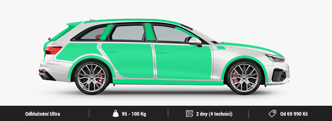 Cena za balíček odhlučnenia Ultra začína na 2 999 € vr. DPH a zahŕňa kompletný materiál aj prácu. Uvedená cena zodpovedá stredne veľkým automobilom, ako je Kia Ceed alebo VW Golf. Finálna cena sa odvíja od množstva použitých materiálov a času potrebného na montáž, a preto je pri menších či väčších vozidlách odlišná.