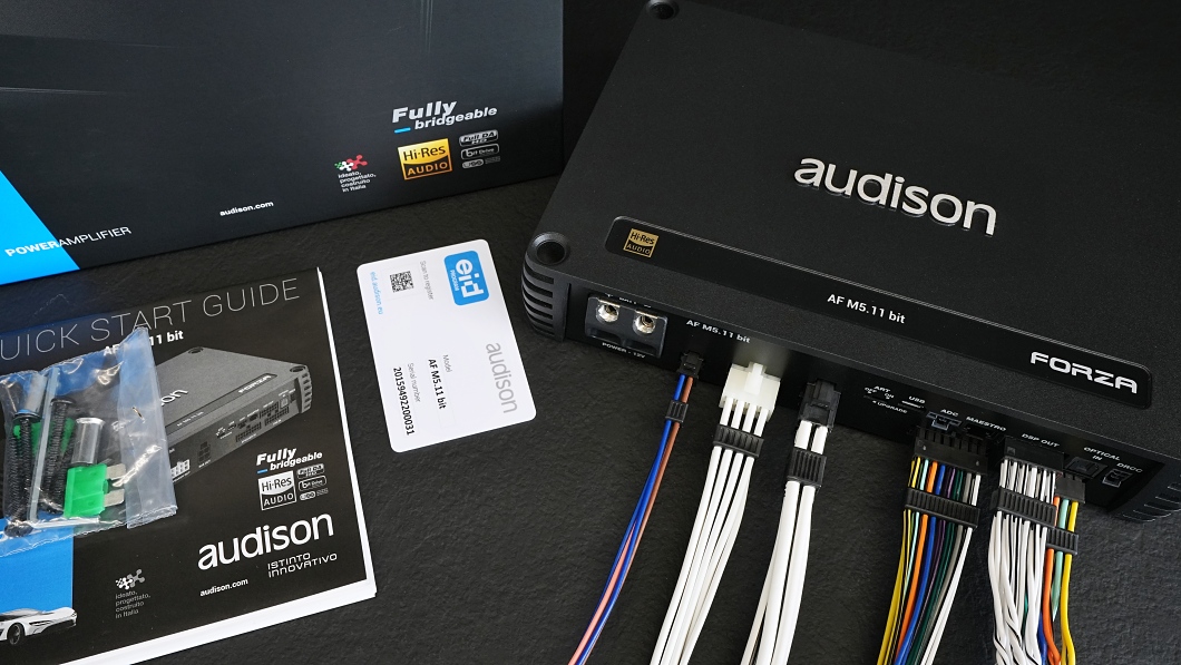 Pre bližšie predstavenie zosilňovačov radu Forza sme vybrali päťkanálový zosilňovač Audison AF M5.11 Bit, ktorému sa budeme detailnejšie venovať v ďalšej časti tohto článku. Nezvolili sme ho náhodou. Zosilňovač sme už niekoľkokrát na našej dielni inštalovali a zoznámili sme sa s jeho všetkými funkciami a samozrejme aj zvukom. O tom však neskôr, teraz sa venujme designu. Zosilňovače Forza sa pýšia veľmi kompaktnými rozmermi vďaka najnovšej technológii triedy ADT, v prípade päťkanálového variantu ide o 240 x 47 x 156 mm. Doplníme, že zosilňovač sa chváli výkonom 4 x 100 + 1 x 400 W RMS pri 4 Ohmoch, čo je na dané rozmery vskutku zaujímavý počin. Podobne skromné rozmery si udržujú aj ostatné zosilňovače Forza. Šasi je vyrobené z liateho hliníka a všetky pripojovacie konektory sú umiestnené pozdĺž prednej hrany zosilňovača, na ktorom nenájdete žiadne ďalšie ovládacie prvky. Na bočnej strane môžete vidieť dve 30A poistky a na tej druhej odnímateľný panel pre voliteľné moduly, ktorými je možné rozšíriť niektoré funkcie zosilňovača. Dizajn je moderný, jednoduchý a na čelnej strane je umiestnené iba logo Audison, označenie modelu, logo radu Forza a certifikáciu Hi-Res Audio. V balení nájdete zvolený zosilňovač, celkom šesť káblov s konektormi Molex, USB kábel, poistky, skrutky, imbus kľúč, identifikačnú kartu s rozšírenou zárukou a samozrejme návod. Zaujímavosťou je, že sú použité uzamykacie konektory Molex, aby bolo vždy zaistené spoľahlivé pripojenie. Káble majú navyše pred konektormi objímky, ktoré zabraňujú krúteniu a zaisťujú presnejšie vedenie káblov do konektora. Vychytávka z kategórie maličkostí, ktorá však poteší.