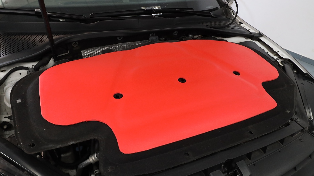 V tejto chvíli pracujeme s predpokladom, že vo vozidle je originálny kryt kapoty. V takom prípade si ho praje väčšina našich zákazníkov najmä z dizajnových dôvodov zachovať a nenahradzovať účinnejším odhlučnením. Aj pre takéto prípady máme veľmi účinný spôsob ako kapotu vozidla odhlučniť. Ideálnym riešením pre tieto účely je zvukovo aj tepelnoizolačný materiál Comfortmat Vision o rozmere 1000 x 700 mm a hrúbkou 6 mm. Vision je moderný, ultraľahký a veľmi flexibilný materiál, ktorého najväčšou devízou je veľmi nízka hmotnosť a zároveň excelentná schopnosť absorbcie hluku. Je vodeodolný, nehorľavý a odolný voči extrémnym teplotám. Používa sa pre odhlučnenie prakticky všetkých plôch vozidla a to najmä tam, kde je vyžadovaná nízka hmotnosť materiálu. A ako Vision aplikujeme? Materiál nalepíme na originálny kryt kapoty a snažíme sa, aby kopíroval jeho tvar. Vision stačí pritlačiť rukou a nie je potrebné používať pritláčací valček. Pre tento spôsob odhlučnenia kapoty takmer vždy s prehľadom vystačí 1 kus materiálu Comfortmat Vision o rozmere 1000 x 700 mm. Zámerne zmieňujeme tento rozmer, pretože Vision je k dostaniu aj v menšom rozmere 500 x 350 mm. Akonáhle máte materiál Comfortmat Vision nalepený na originálnom krytu kapoty, môžete ho nasadiť späť. Aby bolo možné kryt znovu prichytiť na kapotu, je nutné nechať priestor okolo plastových príchytov. Vďaka tomu je opätovné nasadenie jednoduché a bezproblémové.