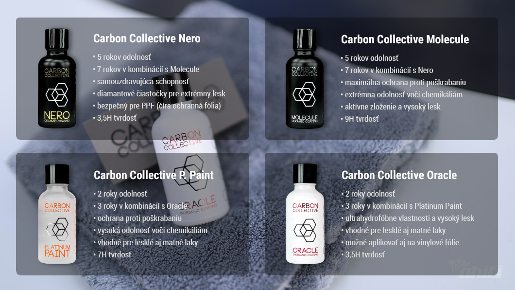 - Carbon Collective Nero - Spoločne s Carbon Collective Molecule ide o najnovší prírastok keramických ochrán laku, ktorý sa pýši hneď niekoľkými úplne unikátnymi vlastnosťami. Ide o ochranu laku s odolnosťou až 5 rokov a pri spojení s Molecule dokonca 7 rokov. Tou najzaujímavejšou vlastnosťou tejto ochrany je však "samouzdravujúca" schopnosť. V práci to funguje tak, že ak na laku nájdete drobné vlasové škrabance, stačí lak poliať horúcou vodou a tieto škrabance sa zatiahnu a zmiznú. Vďaka diamantovým časticiam Nero extrémne zvyšuje lesk a povlak je samozrejme odolný voči poveternostným vplyvom aj chemikáliám.