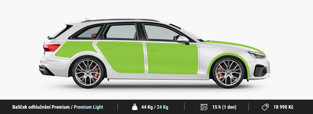 Balíček odhlučnenia Premium zahŕňa odhlučnenie hlavných plôch vozidla, cez ktoré preniká hluk do interiéru. Konkrétne v rámci tohto cenovo zvýhodneného balíčka odhlučňujeme kapotu, predné podbehy, predné dvere, zadné dvere a batožinový priestor, vrátane zadných podbehov z vnútornej strany. Oproti základnému balíčku Standard odhlučňujeme navyše batožinový priestor, cez ktorý preniká do interiéru veľmi vysoké percento hluku. Ide o orientačný balík, rozsah samotného odhlučnenia aj zvolené materiály je možné individuálne prispôsobiť podľa vašich preferencií. Celková hmotnosť použitých tlmiacich materiálov v tomto balíčku je cca 44,6 Kg. Pre tento balíček používame výhradne špičkové membránové materiály Comfortmat zamerané na maximálne možné odhlučnenie, ktoré nie je možné dosiahnuť so žiadnymi inými materiálmi na trhu. S balíčkom Premium získate výrazné zníženie hluku a zvukovú aj tepelnú izoláciu vozidla. Pre zákazníkov, ktorí nechcú príliš navyšovať hmotnosť vozidla ponúkame aj výrazne odľahčenú verziu tohto balíka Premium Light so zníženou hmotnosťou na cca 24,1 Kg pri zachovaní bezkonkurenčnej účinnosti.