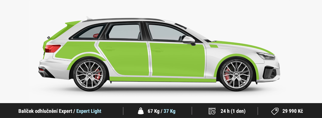 Balíček odhlučnenia Expert zahŕňa takmer kompletné odhlučnenie vozidla. Konkrétne v rámci tohto balíka odhlučňujeme kapotu, torpédo, predná podbehy, predné dvere, zadné dvere, piate dvere, podlahu, batožinový priestor vrátane zadných podbehov z vnútornej strany. Oproti balíčka Premium odhlučňujeme torpédo, piate dvere a najmä podlahu, cez ktorú preniká veľmi vysoké percento hluku. Napriek tomu ide o orientačný balíček a rozsah samotného odhlučnenia aj zvolené materiály je možné individuálne prispôsobiť podľa vašich preferencií. Celková hmotnosť použitých tlmiacich materiálov je cca 67 Kg. Pre tento balíček používame špičkové membránové materiály Comfortmat zamerané na maximálne možné odhlučnenie, ktoré nie je možné dosiahnuť so žiadnymi inými materiálmi na trhu. S balíčkom Expert získate rapídne zníženie hluku a zvukovú aj tepelnú izoláciu vozidla, ktoré v zime stráca menej tepla a v lete udrží chladnejšie teploty. Pre zákazníkov, ktorí nechcú výrazne navyšovať hmotnosť vozidla ponúkame aj odľahčenú verziu tohto balíka Expert Light so zníženou hmotnosťou na cca 37,5 Kg pri zachovaní bezkonkurenčnej účinnosti.