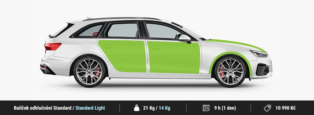 Náš od základu prepracovaný základný balíček Standard zahŕňa odhlučnenie dôležitých plôch vozidla, cez ktoré preniká hluk do interiéru. Naším hlavným cieľom bolo vytvoriť základný balíček, ktorý by nebol iba o nízkej cene, ale aby dával zmysel aj z hľadiska celkového odhlučnenia vozidla. Po dôkladnej analýze predstavujeme balík odhlučnenia, ktorý disponuje nielen vysokou účinnosťou, ale zachováva aj prijateľnú cenu. V rámci tohto cenovo zvýhodneného balíčka teda odhlučňujeme kapotu, predné podbehy, predné a zadné dvere. Ide o orientačný balík, rozsah samotného odhlučnenia aj zvolené materiály je možné individuálne prispôsobiť podľa vašich preferencií. Celková hmotnosť použitých tlmiacich materiálov v tomto balíčku je cca 21,3 Kg. Na odhlučnenie v rámci tohto balíka používame výhradne materiály Comfortmat zamerané na maximálne možné odhlučnenie, ktoré nie je možné dosiahnuť so žiadnymi inými materiálmi na trhu. Pre zákazníkov, ktorí nechcú príliš navyšovať hmotnosť vozidla, ponúkame aj odľahčenú verziu tohto balíka Standard Light so zníženou hmotnosťou na cca 14,7 Kg pri zachovaní bezkonkurenčnej účinnosti.