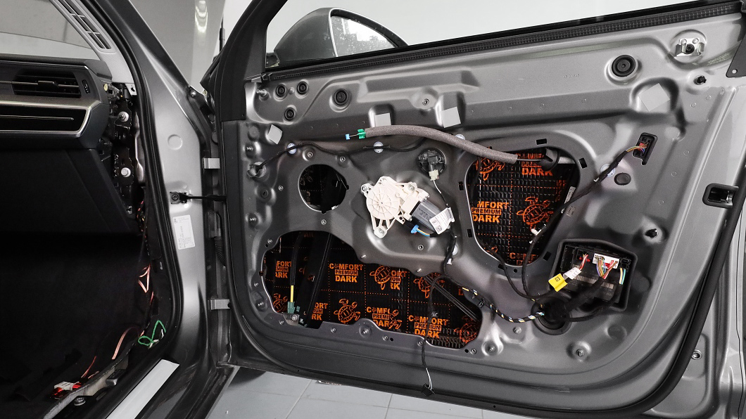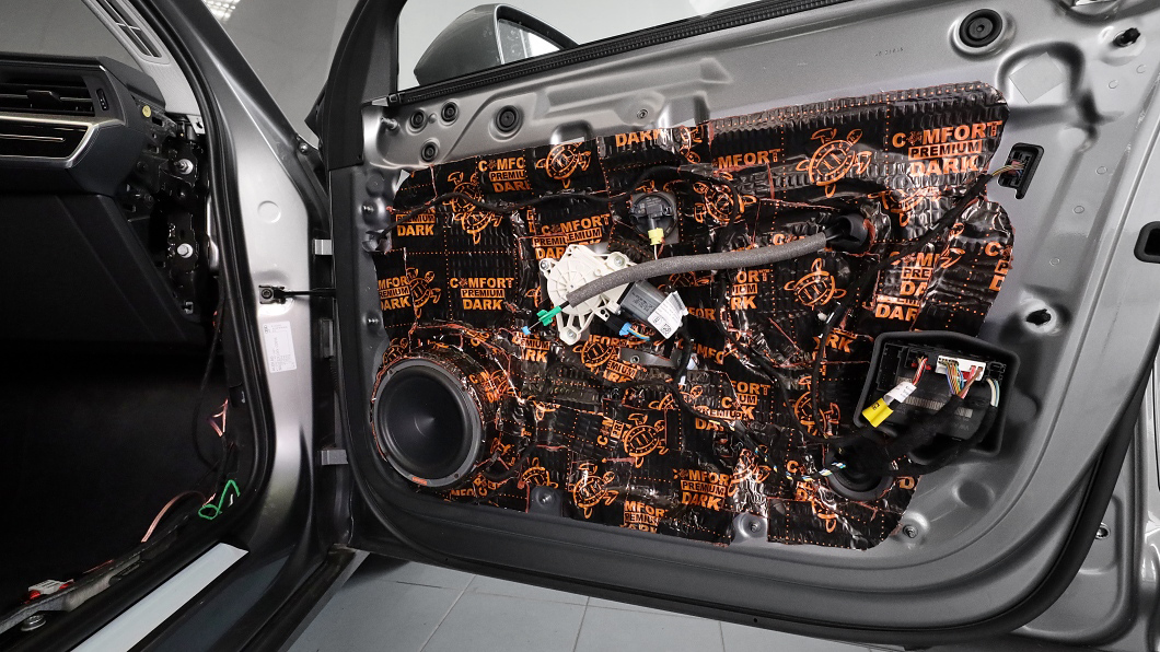 Vnútorný plech tlmíme nielen z dôvodu zamedzenia vibrácií a rezonancií, ale najmä preto, aby sme dvere akusticky uzavreli a vyplnili otvory vo dverách. Tým vytvoríme reproduktorom uzavretú ozvučnicu. To vedie k výraznému zlepšeniu akustiky reproduktorov, najmä ich basovej zložky. A rozhodne nejde o zanedbateľný rozdiel, väčšinu našich zákazníkov obvykle veľmi prekvapí, ako sa zmení zvuk po vytlumení dverí aj u továrenských reproduktorov. Ak inštalujete výkonnejšie reproduktory a zapojíte ich na zosilňovač, efekt vytlmenia je samozrejme výrazne vyšší. Teraz k samotnej aplikácii. Pred nalepením antivibračného materiálu sa musia naspäť nainštalovať plastové záslepky alebo výplň so sťahovacím mechanizmom, ktorá bola k vnútornému plechu dverí priskrutkovaná, alebo prinitovaná. Ak boli nejaké časti pôvodne prinitované, je nutné ich znova prinitovať alebo použiť nitovacie matice. Odporúčame tiež prekontrolovať kabeláž vo dverách a ak je niekde uvoľnená, upevnite ju pomocou sťahovacích pások. Je tiež vhodné skontrolovať, či je kabeláž vo dverách dôkladne opletená. V prípade, že nie je a káble sú bez akejkoľvek ochrany, odporúčame ešte celú kabeláž zaizolovať pomocou textilnej izolačnej pásky, ktorá zamedzí klepanie káblov o plastové a kovové časti dverí a tiež zvýši ochranu samotnej kabeláže. Pre aplikáciu poslednej vrstvy odhlučnenia dverí použijeme opäť špičkový antivibračný materiál Comfortmat Dark D2, prípadne alternatívu z radu Standard alebo Gold. Materiál nalepíme na celú plochu vnútorného plechu dverí a na všetky ochrany proti vlhkosti, ktoré sú skryté pod čalúnením. Nezalepujú sa iba funkčné otvory, ktoré slúžia pre skrutky a plastové príchytky. Pred aplikáciou odporúčame plochu opäť odmastiť vyššie spomenutým čističom. Tlmiaci materiál prilepíme rukou a následne pritlačíme pomocou pritlačovacieho valčeka. Na vnútorný plech dverí vystačia zvyčajne 2 kusy antivibračného materiálu s rozmerom 500 x 350 mm.