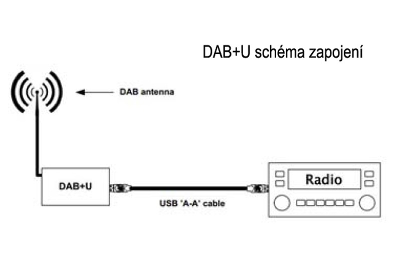 DAB + U - USB DAB prijímač je možné jednoducho pripojiť pomocou prepojovacieho kábla do USB vstupu autorádia alebo iného zariadenia s USB vstupom. Napájanie modulu je zabezpečené z USB zásuvky. Pre príjem DAB vysielania je nutné pripojiť vhodnú anténu s SMB konektorom do anténneho vstupu modulu. Pokus je anténa vybavená vstavaným zosilňovačom s napájaním 12V, pripojte napájanie zosilňovača do konektora umiestneného vedľa USB konektora. Zelená LED dióda na module signalizuje prítomnosť napájania.USB port