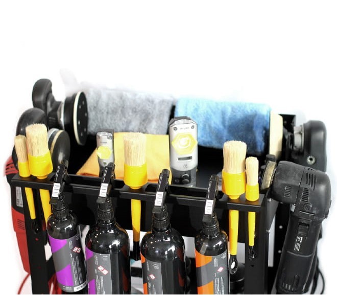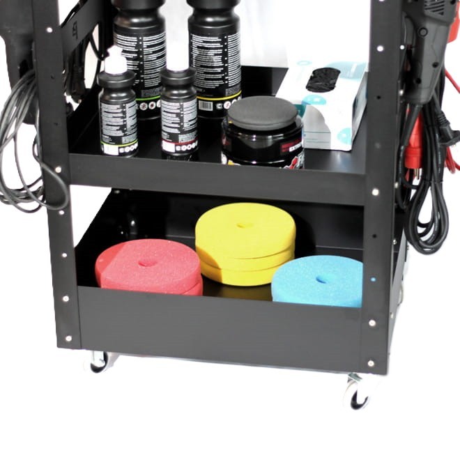 Profesionálna verzia vozíka rozšírená o strednú policu. Vozík je určený nielen do detailingového profesionálneho štúdia, ale aj do garáže každého, kto sa rád stará o svoje vozidlo. Zamerajte sa na pohodlie a funkčnosť! Veľmi praktické riešenie vyrobené z tých najkvalitnejších materiálov, ktoré výrazne zvýšia pohodlie pri detailingu auta. Správna výška, inovatívne riešenie a záruka stability sú len niektoré z jeho výhod. Je vyrobený z vysoko kvalitnej, presne rezanej a ohnutej ocele, ktorá je nakoniec ošetrená práškovou povrchovou úpravou pre čo najväčšiu odolnosť proti oxidácii.