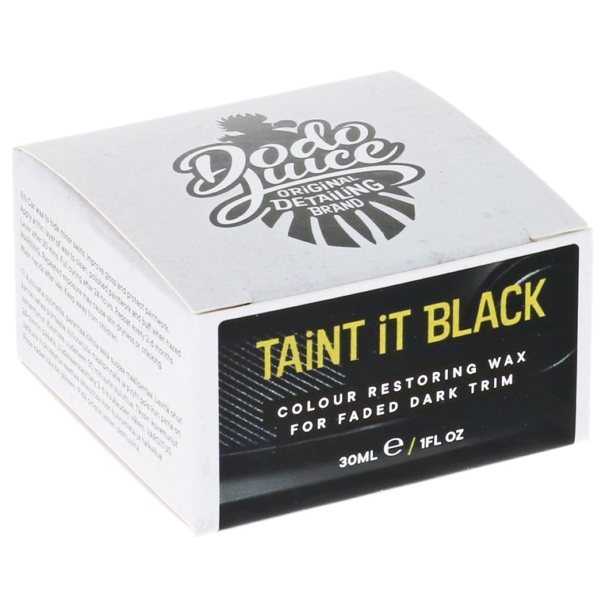 Pred niekoľkými rokmi vytvorili v Dodo Juice produkt Tyromania, vosk na pneumatiky v prirodzenom vzhľade, ktorý vydržal oveľa dlhšie ako tradičné lesky na pneumatiky. Ale mal matný/prirodzený vzhľad, takže nikdy nemal taký úspech, aký by si zaslúžil. Preto prišiel Taint it Black, ktorý stačí naniesť v tenkej vrstve, nechať mierne zaschnúť a za niekoľko minút vyleštiť. Zanecháva tak saténový povrch, ktorý trvá mesiace – nie týždne! Keď sme vykonali test 50/50 na čiernych strešných nosičoch, bol prípravok vidieť aj o celých 8 mesiacov neskôr. (Normálne by sme očakávali aspoň 2-4 mesiace minimálnej životnosti.) Pri degradovaných a UV poškodených plastových častiach je výsledok ešte lepší. Naneste ho vo väčšej vrstve a nechajte ho dlhšie vytvrdzovať; hustý vosk potom môže vyplniť mikroskopické poškodenie bez toho, aby sa odparil. A pretože je to čierny vosk, pôvodná čierna znova sčernie. Je to obrovské vylepšenie a nebudete ho musieť znova aplikovať viac ako niekoľkokrát za rok.Samozrejme ho môžete použiť aj na pneumatikách. Aplikujte na suchú pneumatiku (najlepšie po použití čističa alebo odmasťovača) a po aplikácii Tint it Black o niekoľko minút neskôr zvyšky utrite handričkou, ktorá nepúšťa vlákna. Premení sivohnedé pneumatiky späť na farbu novej pneumatiky, ktorá potom bude čierna po ďalšie týždne. Nebude to príliš lesklé, ale bude to vyzerať veľmi elegantne, a pokiaľ ste už znechutení z používania ochranných prostriedkov na pneumatiky každých štrnásť dní, môže to byť odpoveď práve pre vás. Táto 30 ml nádobka je dostatočná na použitie aspoň na jednu sadu pneumatík, alebo celého čierneho plastového obloženia na priemerne veľkom aute.