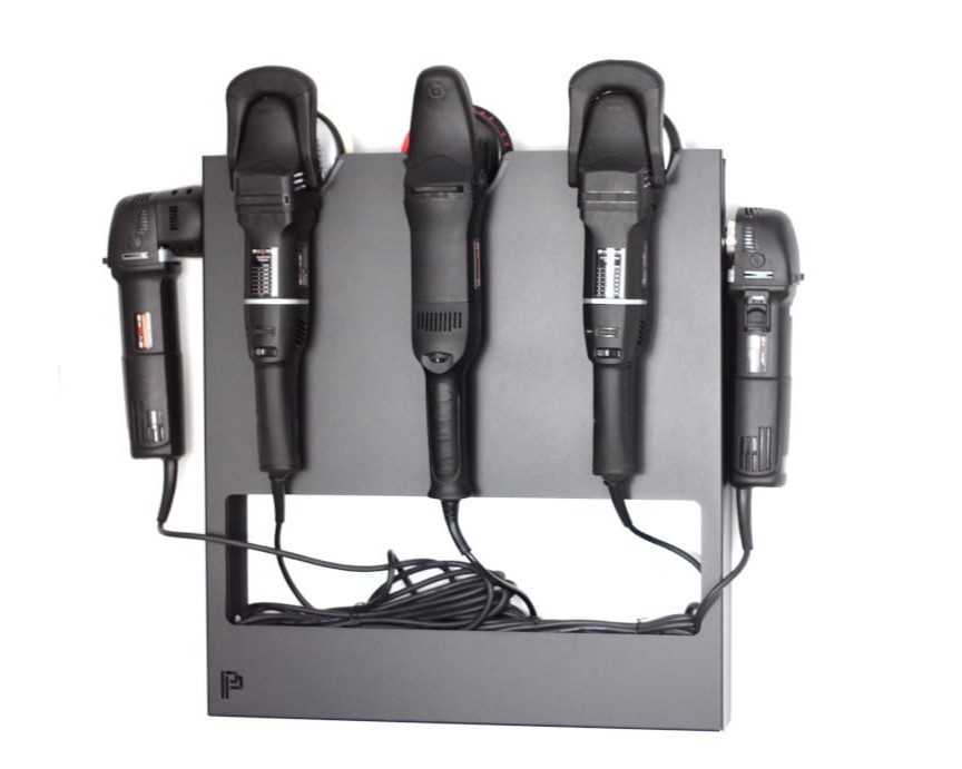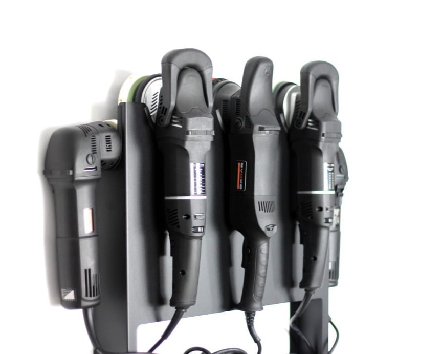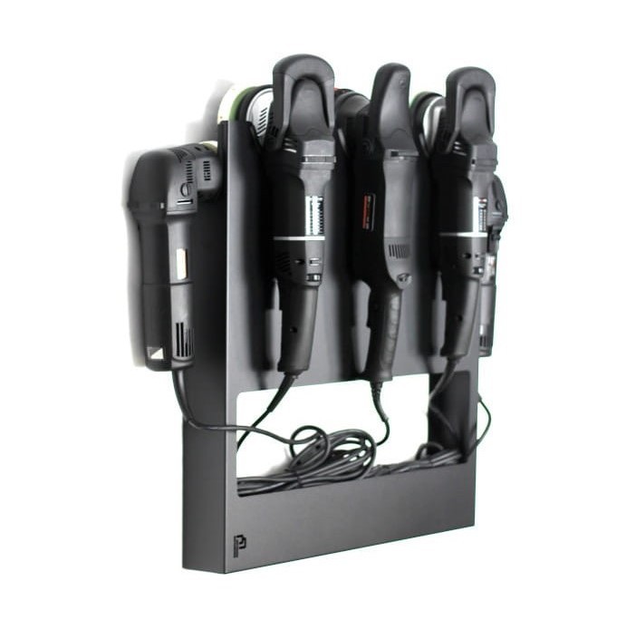 Vysoko kvalitný držiak pre päť leštičiek (3 čelne, 2 na bokoch) s možnosťou uloženia na káble, vďaka čomu zaberú veľmi málo miesta. Držiak je vhodný ako pre DA, tak aj rotačný typ stroja s unášačmi s veľkosťou 30 - 180 mm. Montážne otvory na priskrutkovanie na stenu sú umiestnené v hornej i dolnej časti police a vďaka tomu zaručujú stabilitu. Držiak je vyrobený z kvalitného kovu, ktorý je nalakovaný práškovou farbou, ktorá chráni voči oxidácii.