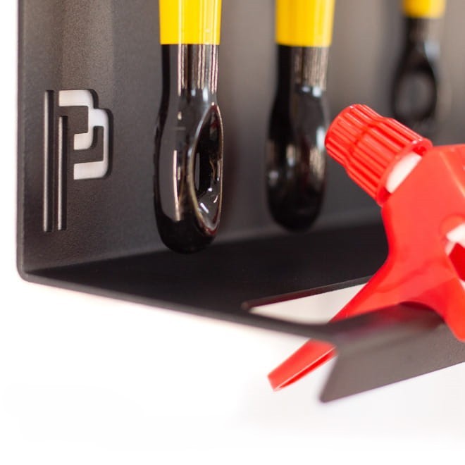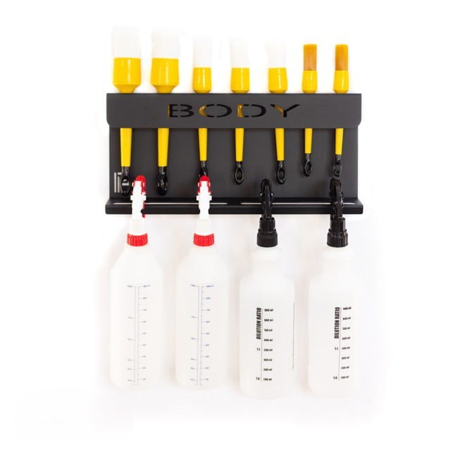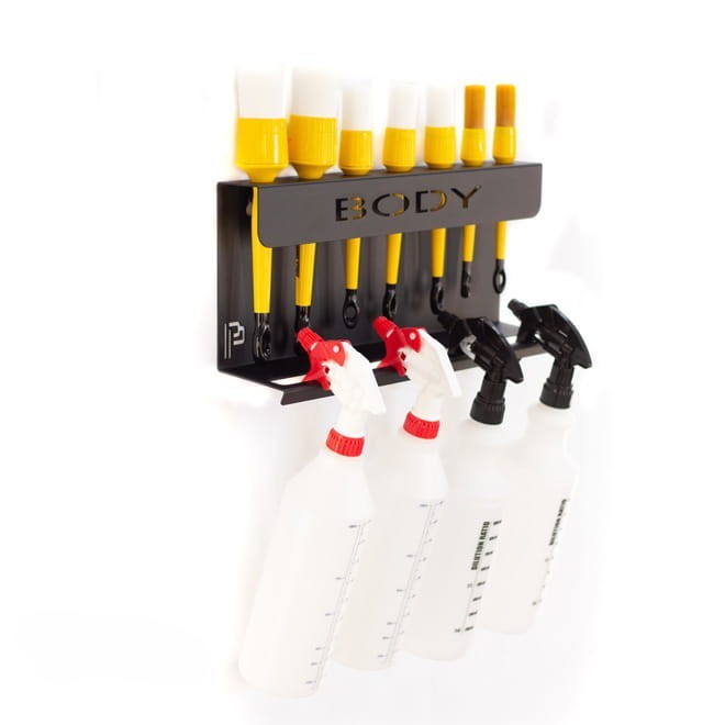 - Nástenný držiak fliaš a detailingových štetcov určených na čistenie exteriéru.