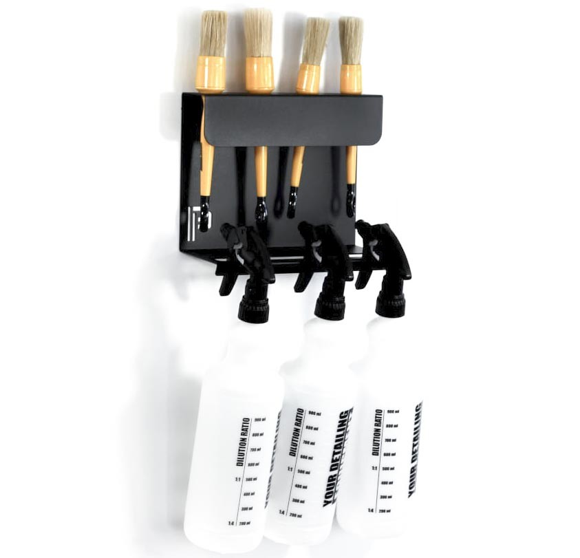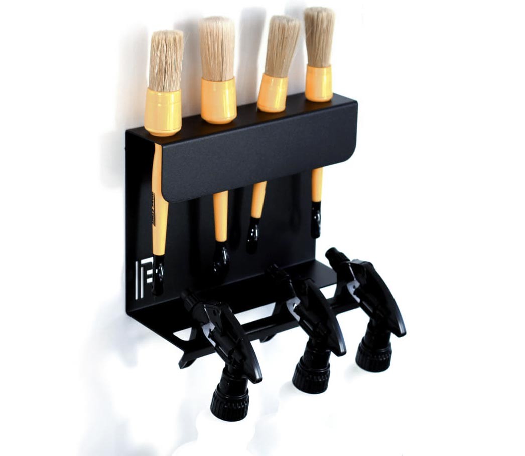 - Nástenný držiak 4 detailingových štetcov a pre 3 fľaše s rozprašovačmi.