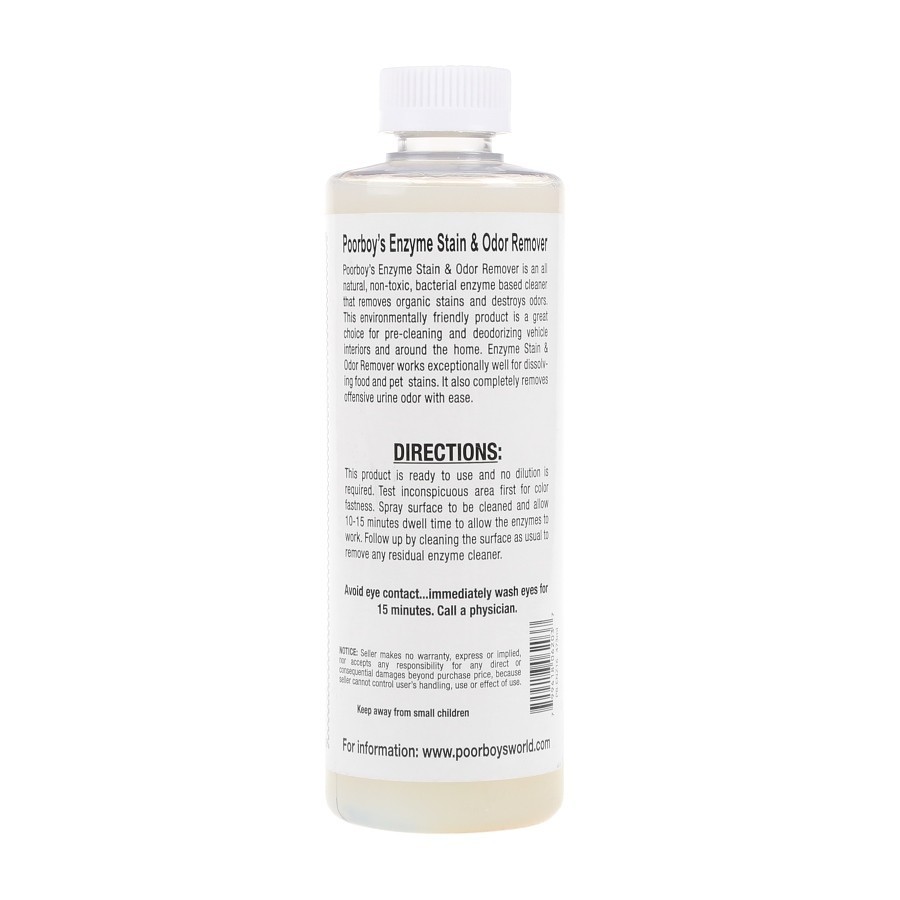 Poorboy's Enzyme Stain & Odour Remover je úplne prírodný a netoxický čistiaci prostriedok založený na pôsobení bakteriálnych enzýmov. Ich úlohou je odstrániť organické škvrny a neutralizovať nepríjemné pachy. Tento ekologický produkt je ideálny na predčistenie a osvieženie interiéru akéhokoľvek vozidla. Je nenahraditeľný pre majiteľov zvierat. Hodí sa aj doma a v každom interiéri, kde sú domáci miláčikovia. Pomáha udržiavať čistotu a zbaviť sa nežiaducich pachov, vrátane úplného odstránenia zápachu moču.