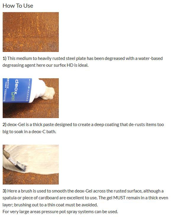 Špičkový gél na odstraňovanie hrdze. Deox-Gel je viskózny odstraňovač hrdze určený na odstraňovanie korózie na povrchoch alebo predmetoch, ktoré sú príliš veľké, aby sa ponorili do kúpeľa Deox-C. Spolu s viskozitnými a konzervačnými látkami sú účinné látky v Deox-Gelu neškodné, netoxické a biologicky odbúrateľné. Gél je maximálne šetrný. Nemusíte nič škrabať ani drhnúť. Ušetríte svoj čas aj energiu. Deox-Gel urobí skoro všetko za vás!
