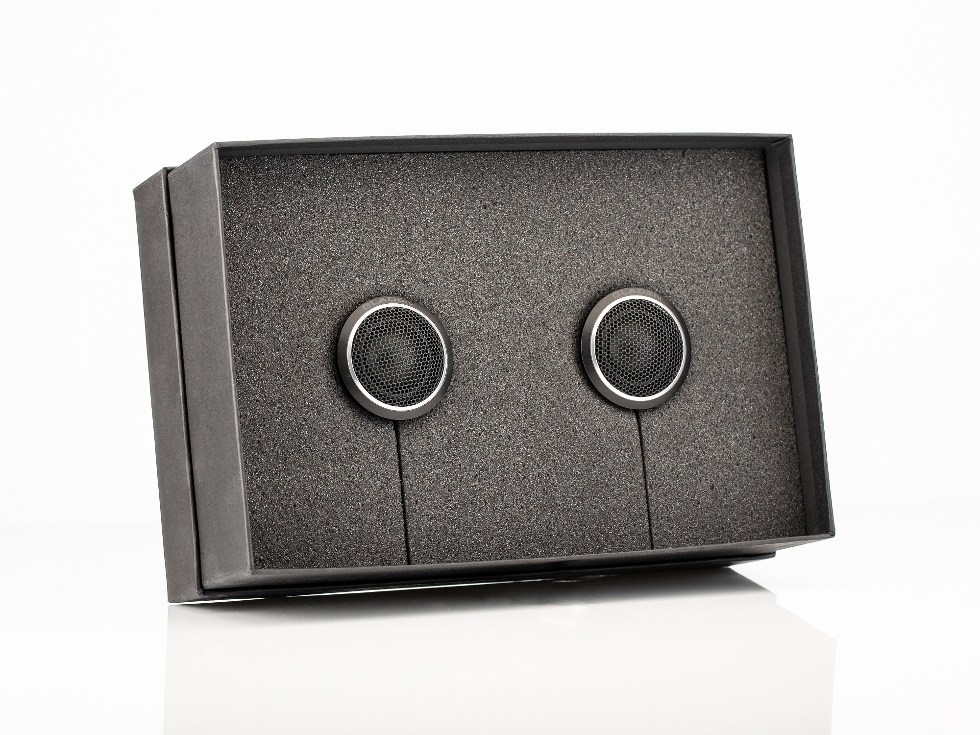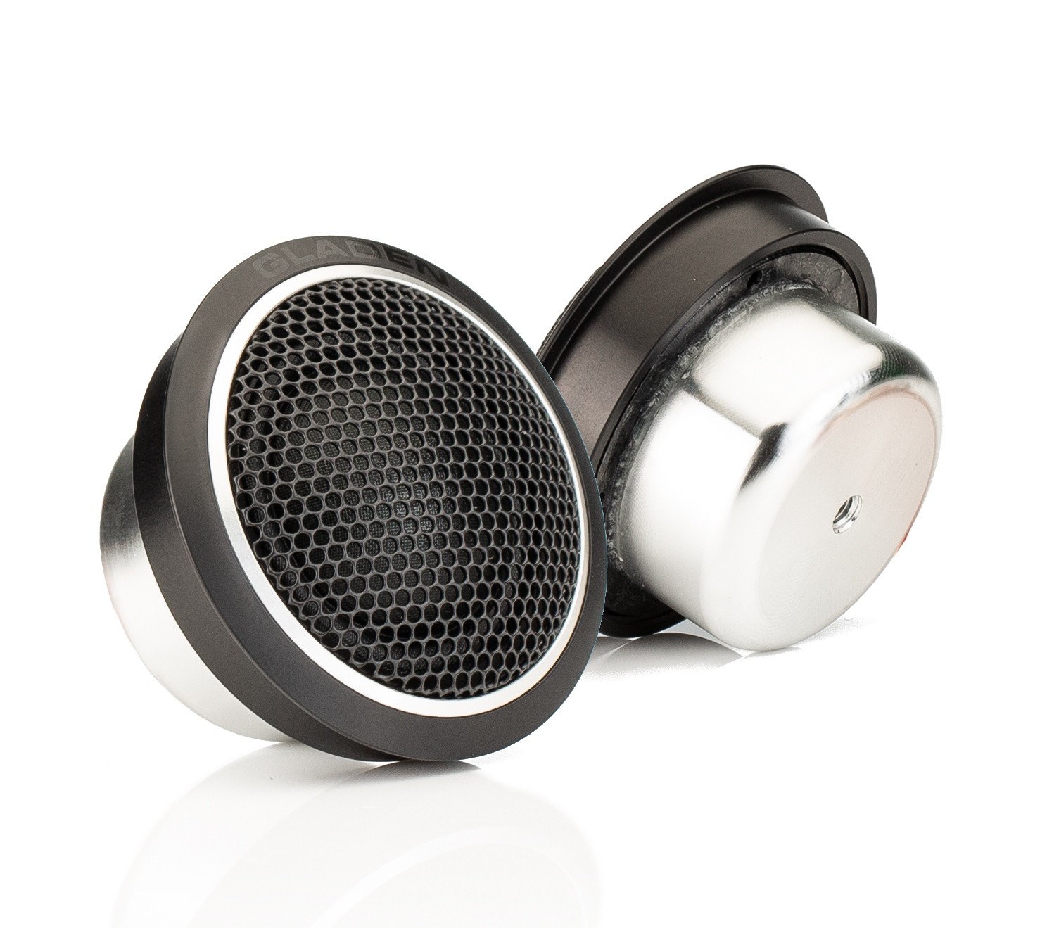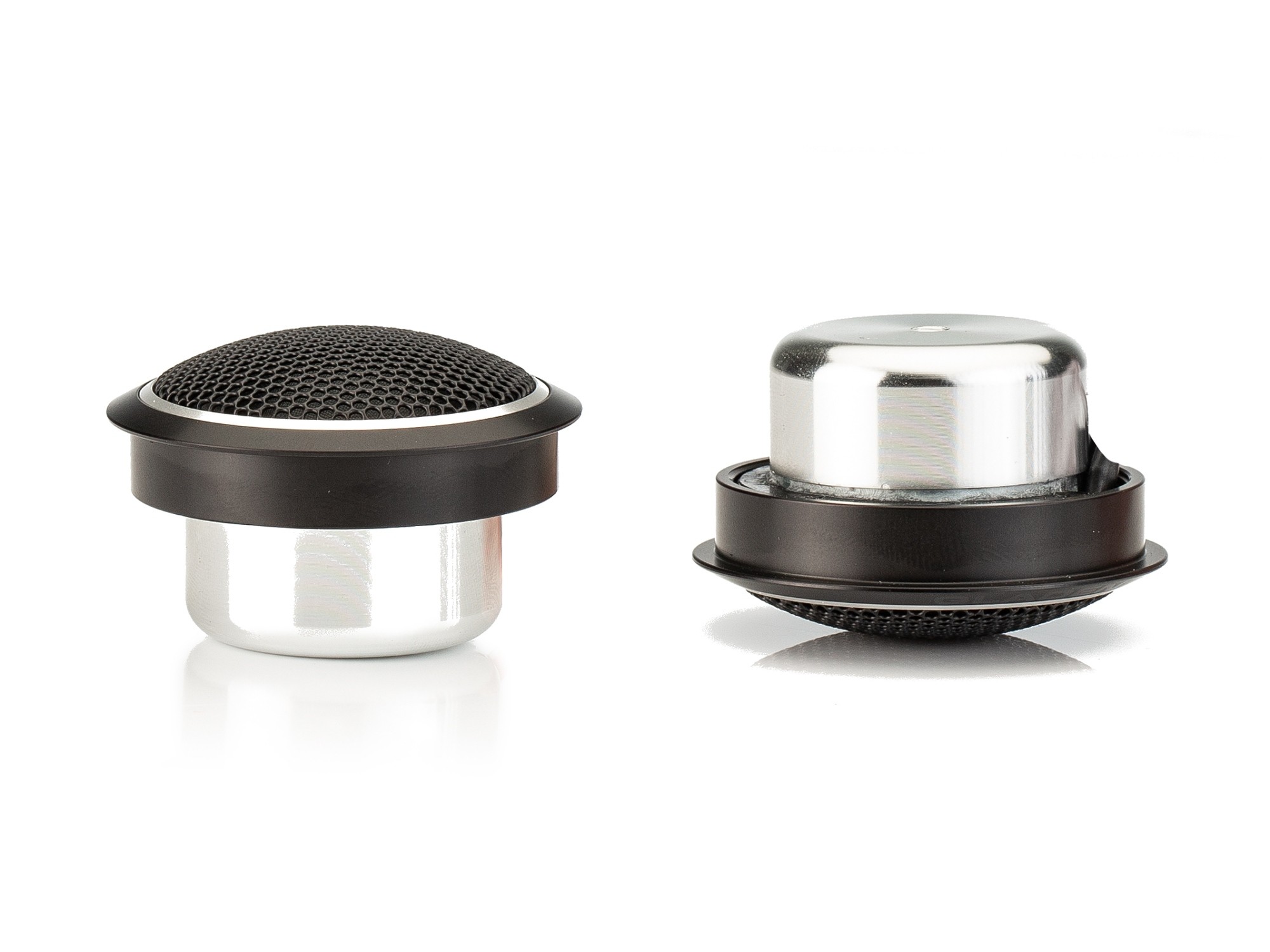 | Typy reproduktorov Koaxiálne reproduktory: Koaxiálne reproduktory sa vyznačujú konštrukciou tzv. Všetko v jednom. Výškový a stredobasový reproduktor sú v jednom koši. Výhodou je jednoduchšia montáž, ale vďaka spojeniu resp. blízkosti pásiem v jednom reproduktore, sa zvyčajne zníži kvalita zvuku. Spravidla uprostred stredobasového reproduktora, je výškový reproduktor, ktorého kmitacia cievka pracuje v druhej vzduchovej medzere spoločného magnatického obvodu. Trojpásmový koaxiálny reproduktor sa skladá zo stredobasového reproduktora, v predu na osobitnom nosníka je stredový reproduktor a samostatný výškový. Komponentné reproduktory: Komponentné reproduktory sa vyznačujú rozdelením na jednotlivé frekvenčné pásma, výškové + stredobasové + popr. basové pásmo. Jednotlivé reproduktory sa dajú umiestniť úplne oddelene, čo má za výsledok lepší zvukový aj akustický prejav. V drvivej väčšine prípadov komponentných reproduktorov je dodávaná aj externá výhybka, ktorá rozdeľuje výškové, stredové / stredobasové a u třípásma aj basové pásmo popr. umožňuje nastavenie decibelovej úrovne u výškového reproduktoru (napr. +2 dB, 0 dB, -2 dB), strmosti (napr. 6dB / okt. 12dB / okt.) či aktívne alebo bi-amp zapojenia. | Výškové |
