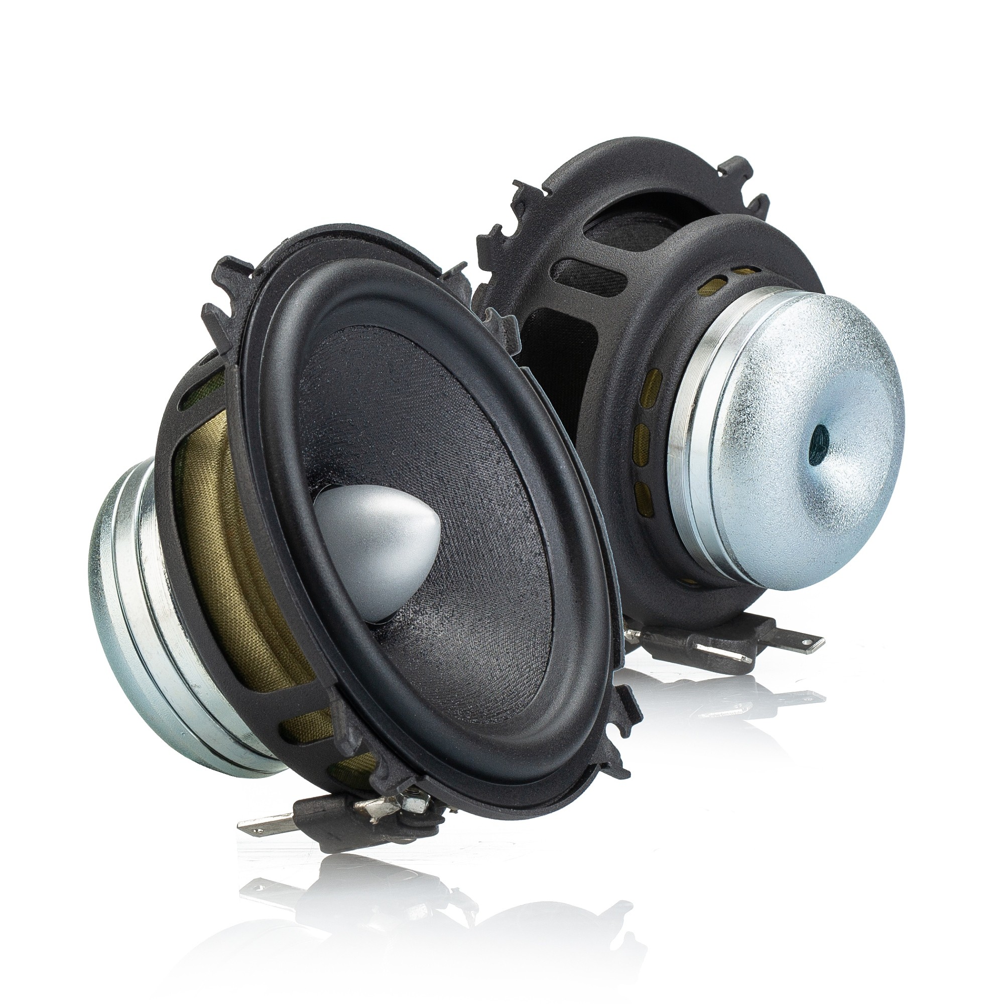 | Typy reproduktorov Koaxiálne reproduktory: Koaxiálne reproduktory sa vyznačujú konštrukciou tzv. Všetko v jednom. Výškový a stredobasový reproduktor sú v jednom koši. Výhodou je jednoduchšia montáž, ale vďaka spojeniu resp. blízkosti pásiem v jednom reproduktore, sa zvyčajne zníži kvalita zvuku. Spravidla uprostred stredobasového reproduktora, je výškový reproduktor, ktorého kmitacia cievka pracuje v druhej vzduchovej medzere spoločného magnatického obvodu. Trojpásmový koaxiálny reproduktor sa skladá zo stredobasového reproduktora, v predu na osobitnom nosníka je stredový reproduktor a samostatný výškový. Komponentné reproduktory: Komponentné reproduktory sa vyznačujú rozdelením na jednotlivé frekvenčné pásma, výškové + stredobasové + popr. basové pásmo. Jednotlivé reproduktory sa dajú umiestniť úplne oddelene, čo má za výsledok lepší zvukový aj akustický prejav. V drvivej väčšine prípadov komponentných reproduktorov je dodávaná aj externá výhybka, ktorá rozdeľuje výškové, stredové / stredobasové a u třípásma aj basové pásmo popr. umožňuje nastavenie decibelovej úrovne u výškového reproduktoru (napr. +2 dB, 0 dB, -2 dB), strmosti (napr. 6dB / okt. 12dB / okt.) či aktívne alebo bi-amp zapojenia. | Stredové |