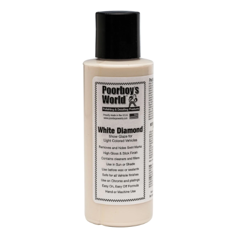 White Diamond Glaze je ľahko aplikovateľný glaze výhradne určený pre svetlé laky. Všetky biele, strieborné a svetlé farby budú svietiť ako diamant. White Diamond pomáha vyťažiť maximum zo svetlých farieb a pomáha skryť ľahké hologramy, škrabance a farebné nedokonalosti. White Diamond je určený pre detailerov, nadšencov a majiteľov výstavných vozidiel, ktorí chcú mať k dispozícii najlepší, najhlbší a najviac mokrý lesk. Je možné aplikovať tak často, ako je potrebné. Môže byť doplnený o vosk alebo sealant, alebo ponechaný len tak. Určené na každodenné použitie. White Diamond je posledný tzv. "Last Stage Product" (LSP) pred nanesením vosku alebo sealantu. Pokiaľ sa vám objaví malý škrabanec a nechce sa vám vyťahovať brúsna pasta, môžete tieto nedokonalosti skryť práve týmto White Diamond glazom. White Diamond je možné aplikovať ručne alebo strojovo. Môžete ho aplikovať ako na slnku, tak v tieni. White Diamond je možné dokonca aplikovať aj na chróm, zvýšite tak jeho ligot a odrazivosť svetla. White Diamond sa nanáša rovnako ako vosk.
