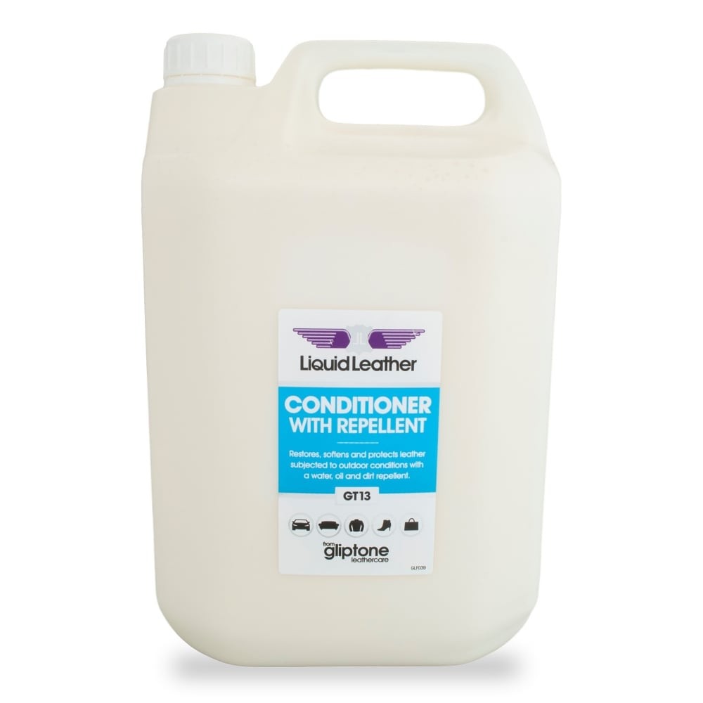 Gliptone Liquid Leather Conditioner With Repellent GT13 je kondicionér určený na ochranu a vyživenie kožených povrchov s možným vystavením vonkajším vplyvom (napríklad pre kabriolety). GT13 Conditioner With Repellent je nemastný prípravok na vodnej báze, ktorý odpudzuje vodu a špinu. Je preto ideálnym prípravkom na vyživenie kože kabrioletov, pre motorkárske oblečenie, kabelky a pod. Nie je vhodný pre semiš, lakovanú kožu alebo kožu s gumovým povrchom.
