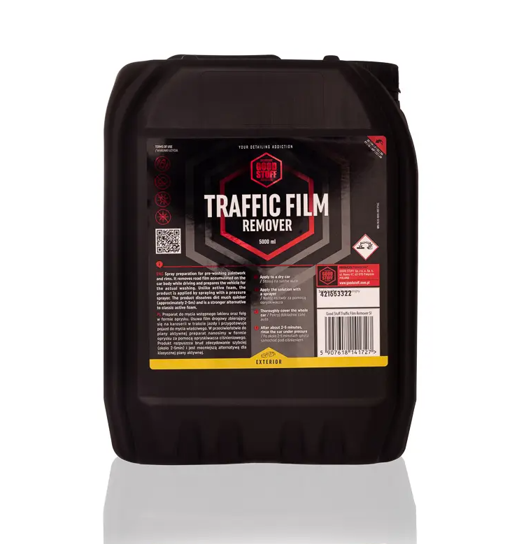Good Stuff Traffic Film Remover je koncentrovaný prípravok na predumytie karosérie a ráfikov. Odstraňuje cestný film nahromadený na karosérii počas cestnej premávky a pripravuje vozidlo na samotné kontaktné umývanie. Na rozdiel od aktívnej peny sa prípravok nanáša nástrekom tlakovým rozprašovačom. Prípravok rozpúšťa nečistoty oveľa rýchlejšie a je silnejšou alternatívou ku klasickej aktívnej pene.