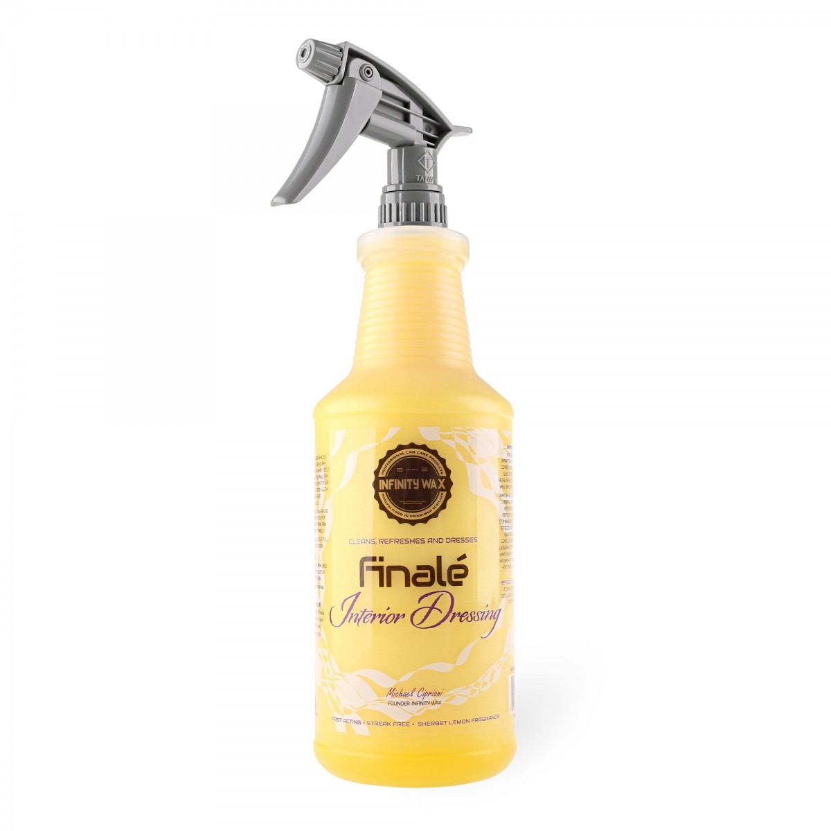 Finale je ideálny prípravok, čistič na interiérové plasty, vinyl a čalúnenie. Po aplikácii ponúkne toľko obľúbený a žiadaný saténový efekt / výsledok. Po aplikácii Finale je ošetrený povrch antistatický a interiér rozvonia po citrónových bonbónoch. Finale môže byť aplikovaný priamo na vnútorné plasty alebo na mikrovláknovú utierku, aby sa zabránilo nadmernému nastriekaniu na sklo. Finale je tiež vhodný pre použitie na plastoch v motorovom priestore a vonkajších plastových častiach vozidla. Finale je možné riediť až v pomere 1:5 v závislosti od aplikácie.