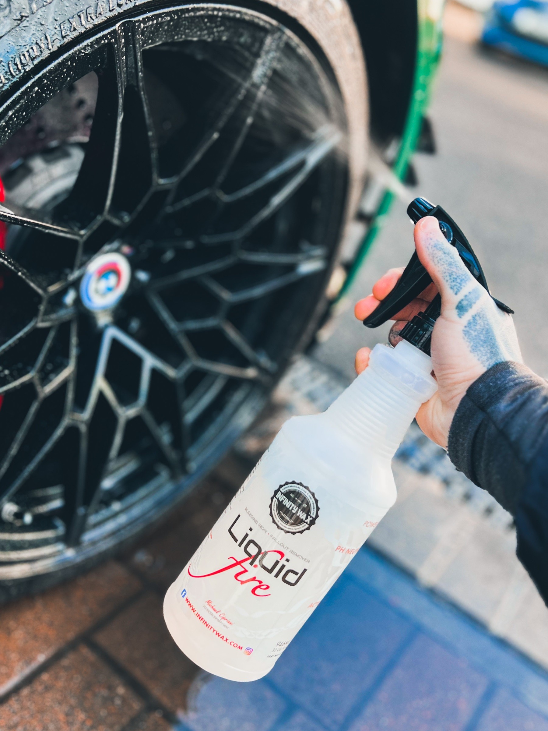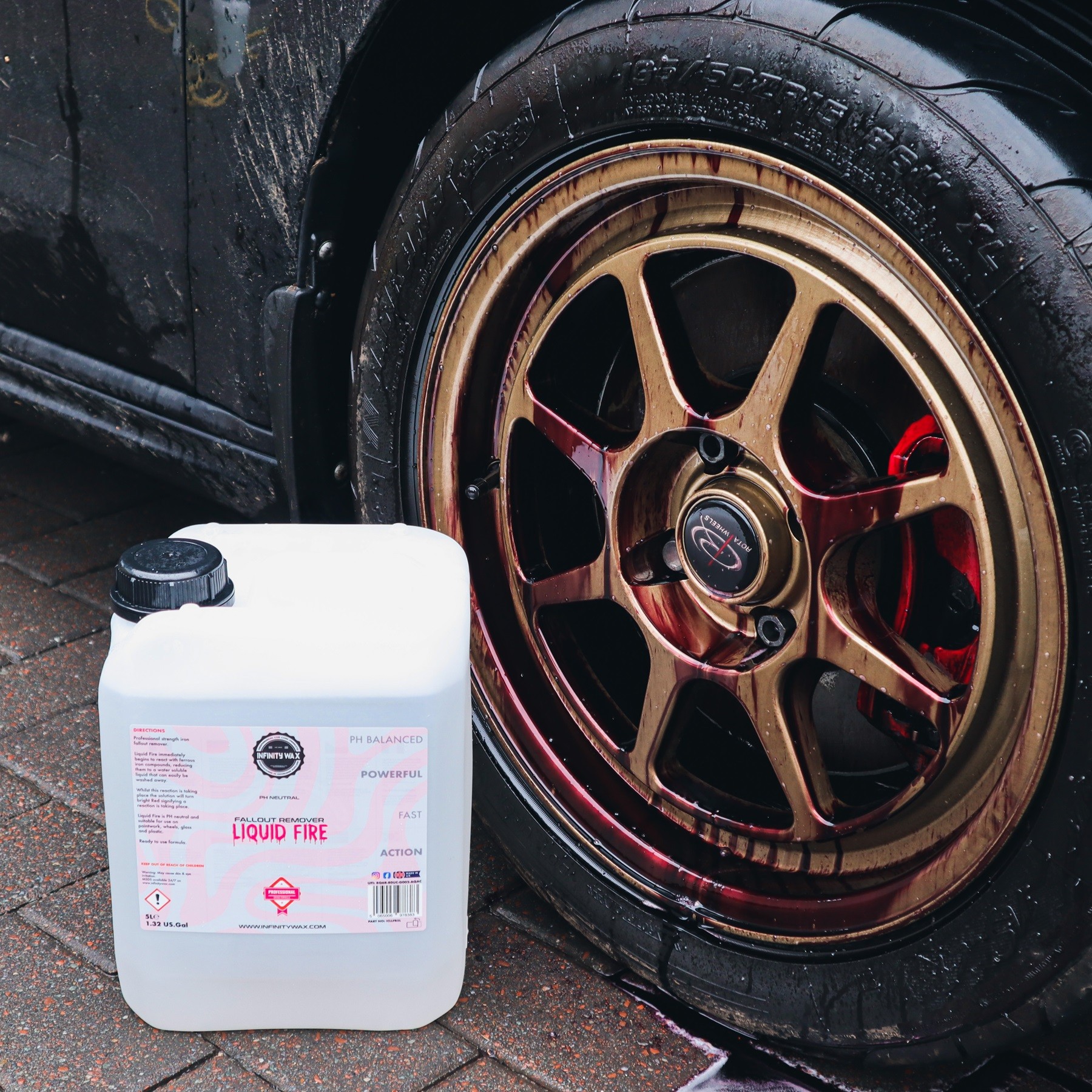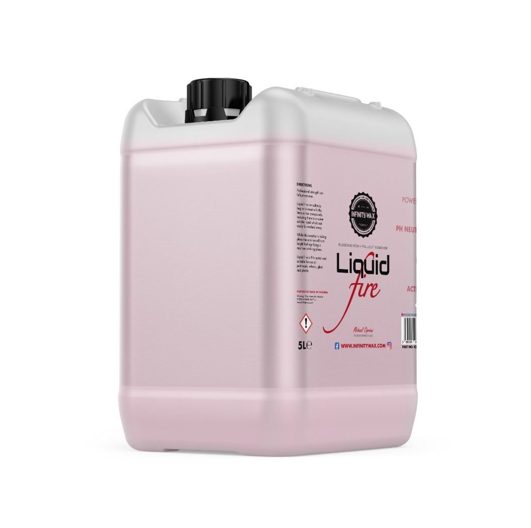 Liquid Fire je profesionálny odstraňovač železných častíc a čistič kolies. Jeho hlavnou funkciou je rozpúšťať usadené častice železa a umožniť ich bezpečné spláchnutie. Okrem toho je Liquid Fire aj mimoriadne schopný čistič kolies, ktorý dokáže odstrániť všetok brzdový prach a škvrny na kolesách pri jedinom použití pomocou kefy na kolesá. Pri testovaní v Anglicku bol účinnejší ako najsilnejšie kyslé čističe kolies na trhu a v porovnaní s nimi bol aj neuveriteľne bezpečný. Liquid Fire využíva na čistenie chemickú reakciu, v počiatočnej fáze reaguje mierna kyselina (tioglykolát sodný), ktorá vytvára silnú oxidáciu železných častíc železa a mení ich na sýto červenú/fialovú farbu. Medzitým amónne ióny obsiahnuté v chemickej reakcii pôsobia na rozklad "zakorenených" nečistôt, aby sa tento výrobok stal skutočne účinným roztokom na hĺbkové čistenie kolies. Pokiaľ si pamätáme, odstraňovače hrdze a kyslé čističe kolies boli vždy dva samostatné produkty. Teraz, s trochou šikovnej chémie, môžete mať 2 v 1, kde skutočne vyniknú oba. Je neuveriteľne bezpečný pre vašu pokožku a vozidlo, na ktorom pracujete. Tekutý oheň by sa mal používať pred alebo po procese umývania v závislosti od požadovaných výsledkov. Odporúčame ho používať ako čistič kolies pred predumytím. Ak chcete odstrániť železné častice na karosérii, použite ho po umytí vozidla, aby sa prípravok účinnejšie dostal k usadeným nečistotám.