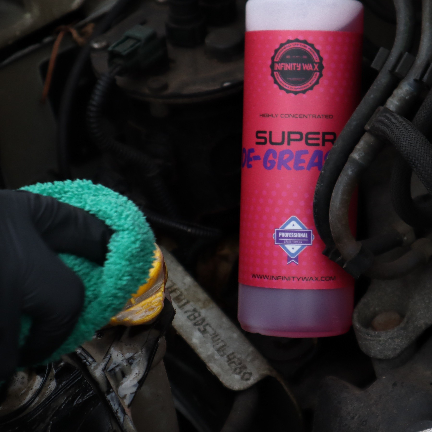 Infinity Wax Super De-greaser je produkt, po ktorom siahnete, keď vám univerzálny čistiaci prostriedok jednoducho nestačí. Jeho gélová konzistencia umožňuje jeho nanášanie, ale aj priľnutie a zotrvanie na znečistenom povrchu až 20 minút. Počas tohto dlhého času začne výrobok emulgovať a spojí sa s mastnotou alebo olejom, čo vám umožní veľmi ľahko ho opláchnuť alebo zotrieť z povrchu. Ide o čistiaci prostriedok na báze vody, ktorý je nepostrádateľný, ak čistíte spaľovací motor alebo priestor okolo neho - je to dokonalý čistič motorového priestoru. Jeho alkalické, povrchovo aktívne látky sú vyrobené z najsilnejšieho materiálu na báze sodíka v kombinácii so silnými emulgátormi a separačnými látkami. Tento viacúčelový odmasťovač možno použiť rôznymi spôsobmi, od čistého postreku až po zriedenie rozprašovačom. Odporúčané riedenie je 200 ml výrobku a 800 ml teplej vody. Infinity Wax Super De-greaser možno použiť v ktorejkoľvek fáze umývacieho procesu alebo ako samostatný čistiaci prostriedok.