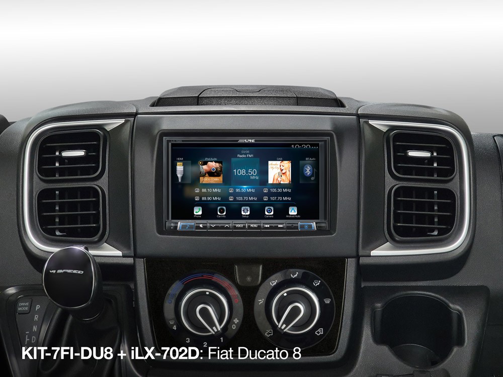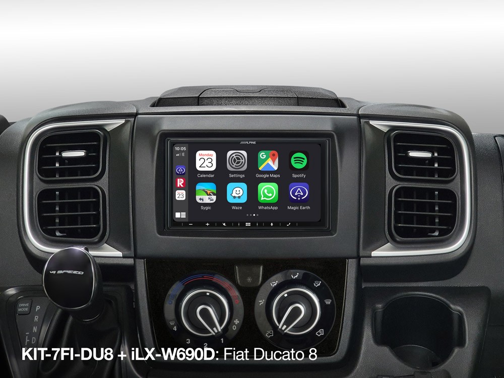Inštalačná sada KIT-7FI-DU8 vám umožní dokonale integrovať Alpine 2DIN navigačný alebo mediálny systém do Fiat Ducato III verzie 8. Je kompatibilný s Alpine INE-W611D / INE-W611DC, iLX-705D, iLX-W690D a INE-W720D / INE- W720DC. Obsahuje všetky kovové držiaky a skrutky, káblový zväzok plug-and-play a rozhranie diaľkového ovládania na volante pre dokonalú inštaláciu a taktiež 2DIN plastovú ozdobnú dosku pre čistú integráciu do vašej palubnej dosky. Pokiaľ je vaše Ducato vybavené originálnou nabíjačkou telefónu Qi, môžete ju naďalej používať so systémom Alpine. To si vyžaduje samostatne predávaný adaptér KWE-Qi-DU8.