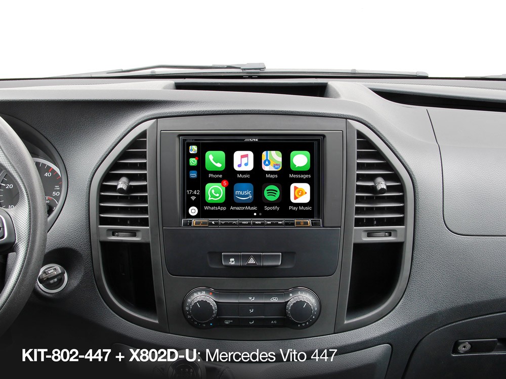 Inštalačná sada (8") pre model vozidla Mercedes Vito (447) 2014 a novšia. Táto sada je dodávaná so všetkými požadovanými inštalačnými dielmi, ako je adaptér portu USB / AUX, káblový zväzok, rozhranie zbernice CAN, inštalačné držiaky, anténny adaptér s fantómovým napájaním, napájací adaptér quadlock a ozdobný panel. To značne uľahčuje inštaláciu a umožňuje použitie ovládacích tlačidiel na volante a informačného displeja vozidla s vašim výrobkom Alpine. KIT-802-447 v kombinácii s X803DC-U / X803D-U / X802DC-U / X802D-U ponúka špičkovú navigáciu vrátane navádzania šípok krok za krokom na multifunkčnom displeji, spárovanú s kompatibilitou DAB+, Android Auto a Apple CarPlay.