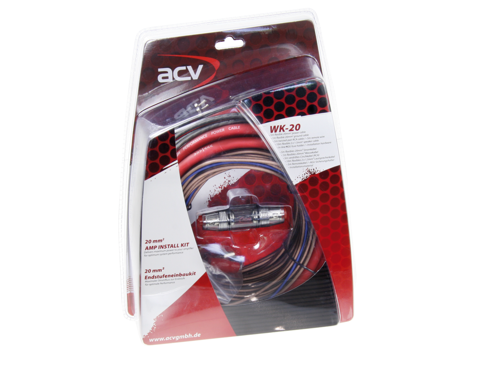 Káblová sada ACV WK-20 je kvalitná inštalačná sada určená pre automobilové audio systémy s výkonom až 900 W RMS. Je ideálna pre inštaláciu základného dvojkanálového zosilňovača. Výhodou sú medené napájacie káble.