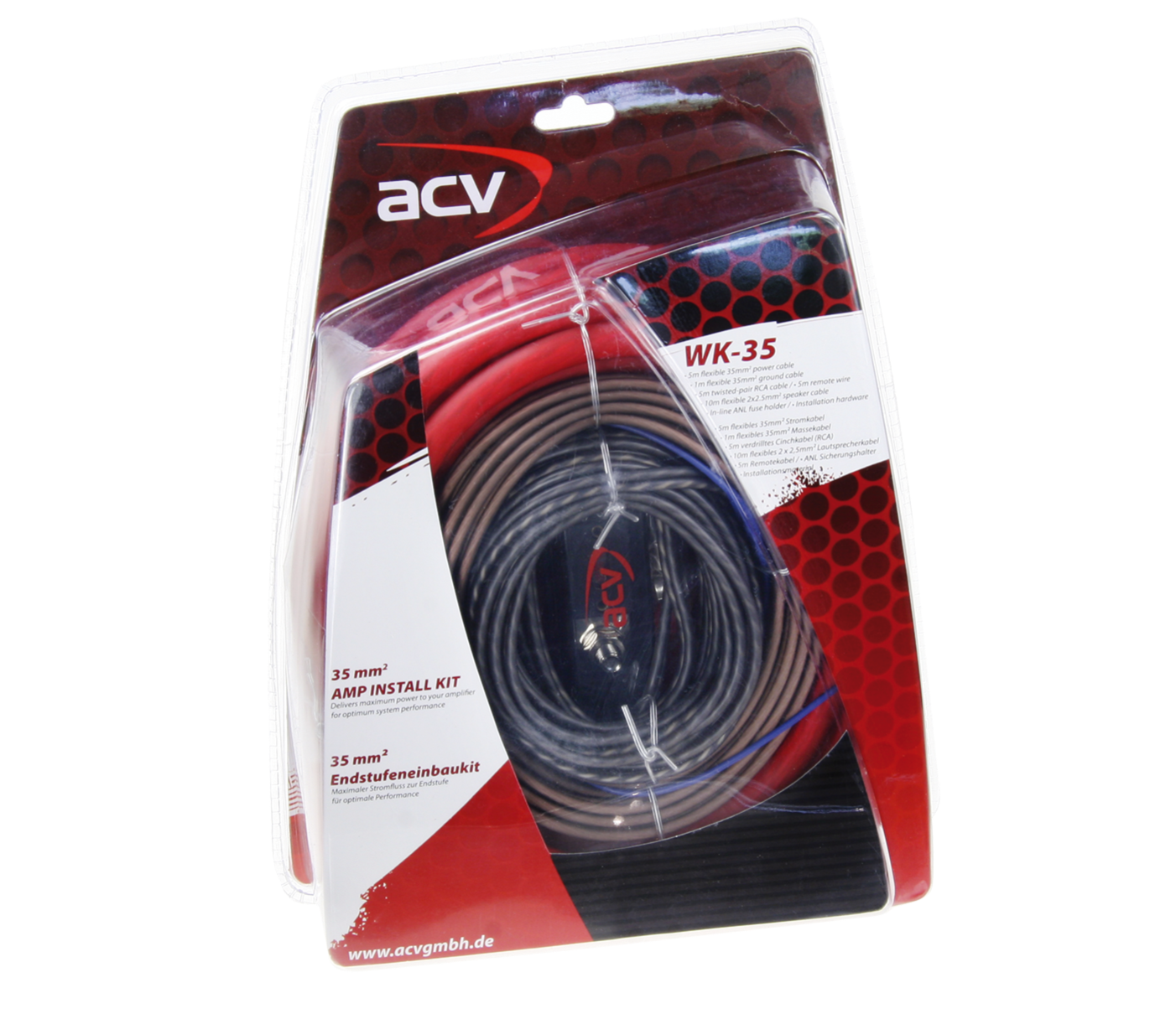 Káblová sada ACV WK-35 je kvalitná inštalačná sada určená pre automobilové audio systémy s výkonom až 1600 W RMS. Je ideálna pre inštaláciu základného dvojkanálového zosilňovača. Výhodou sú medené napájacie káble.