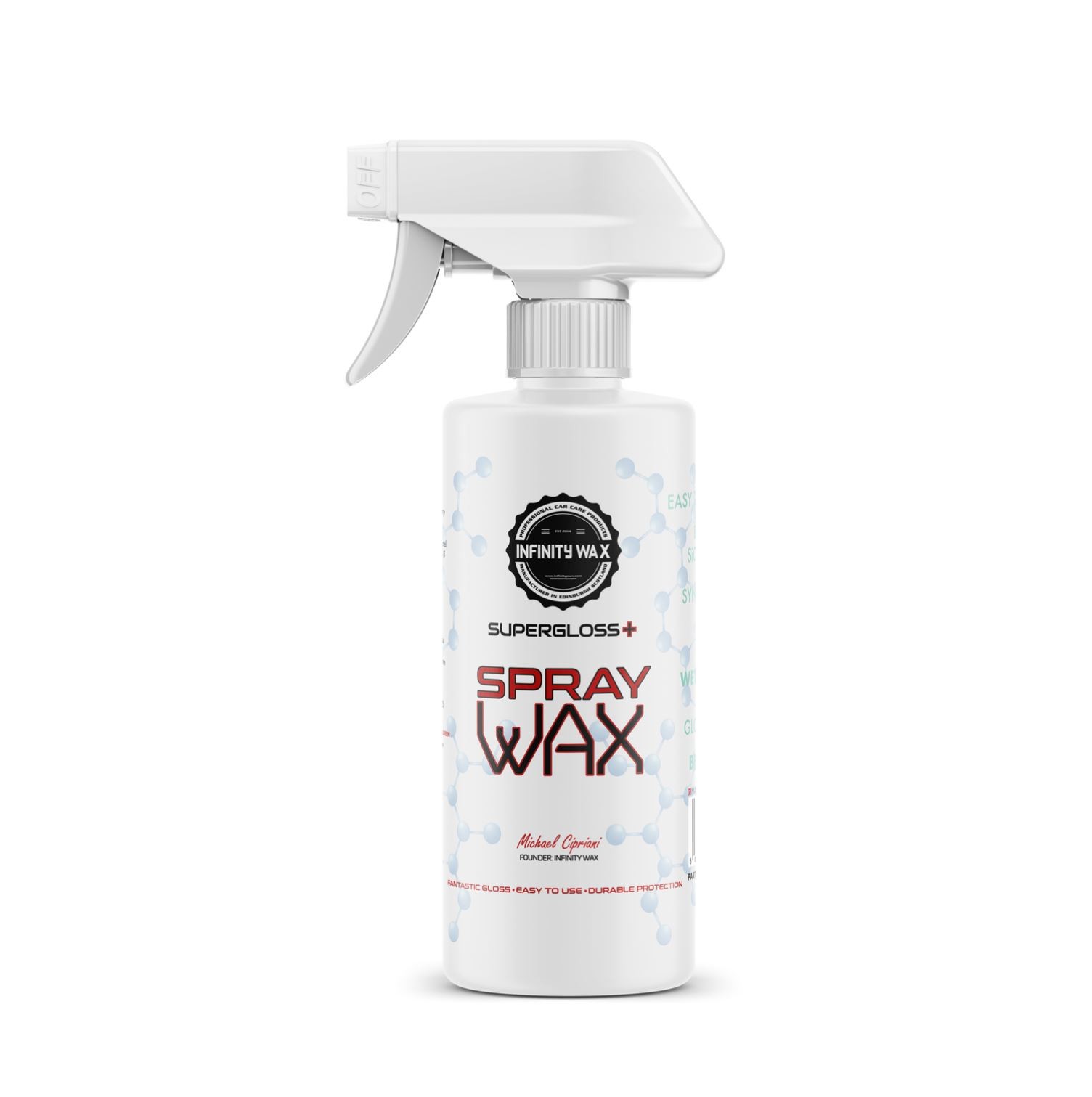 SuperGloss+ Spray Wax je nový variant obľúbeného vosku s rovnakým názvom, ale s tým rozdielom, že tento vosk sa dá aplikovať pomocou fľaše s rozprašovačom. Jeho veľkou výhodou je vynikajúci lesk, jednoduchá aplikácia a výborné hydrofóbne vlastnosti. Vďaka obsiahnutým polymérom vydrží 6 až 8 mesiacov s maximálnym účinkom. Práve vďaka tomu je SuperGloss+ jasnou voľbou pri výbere vosku, teraz v novej, tekutej forme.