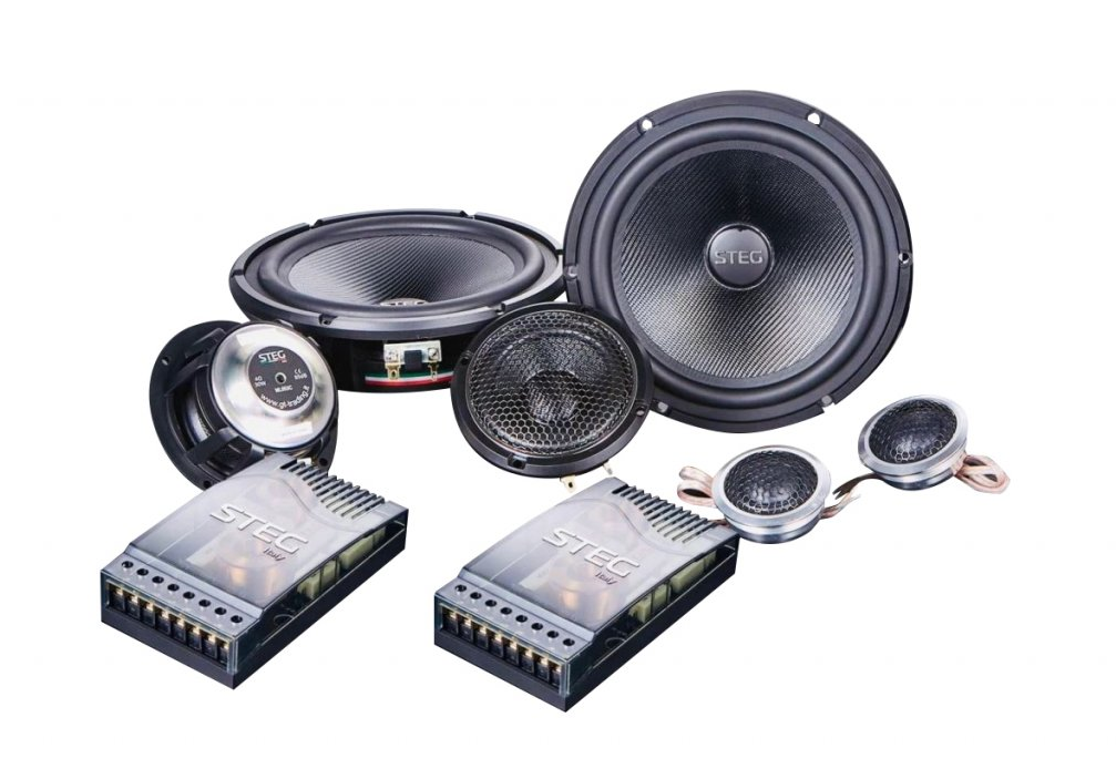 | Typy reproduktorov Koaxiálne reproduktory: Koaxiálne reproduktory sa vyznačujú konštrukciou tzv. Všetko v jednom. Výškový a stredobasový reproduktor sú v jednom koši. Výhodou je jednoduchšia montáž, ale vďaka spojeniu resp. blízkosti pásiem v jednom reproduktore, sa zvyčajne zníži kvalita zvuku. Spravidla uprostred stredobasového reproduktora, je výškový reproduktor, ktorého kmitacia cievka pracuje v druhej vzduchovej medzere spoločného magnatického obvodu. Trojpásmový koaxiálny reproduktor sa skladá zo stredobasového reproduktora, v predu na osobitnom nosníka je stredový reproduktor a samostatný výškový. Komponentné reproduktory: Komponentné reproduktory sa vyznačujú rozdelením na jednotlivé frekvenčné pásma, výškové + stredobasové + popr. basové pásmo. Jednotlivé reproduktory sa dajú umiestniť úplne oddelene, čo má za výsledok lepší zvukový aj akustický prejav. V drvivej väčšine prípadov komponentných reproduktorov je dodávaná aj externá výhybka, ktorá rozdeľuje výškové, stredové / stredobasové a u třípásma aj basové pásmo popr. umožňuje nastavenie decibelovej úrovne u výškového reproduktoru (napr. +2 dB, 0 dB, -2 dB), strmosti (napr. 6dB / okt. 12dB / okt.) či aktívne alebo bi-amp zapojenia. | Komponentné 3pásmové |