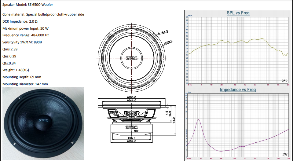 Model reproduktorov SE650C je navrhnutý dizajnérmi STEG tak, aby tieto reproduktory poskytovali dokonalý detailný zvuk pre každý typ reprodukcie. Stredobasový reproduktor má dvojitý gumový záves a membránu zo skleného vlákna. Parametre výškových reproduktorov s dvojitou kompozitnou membránou potom prinášajú neskutočnú čistotu zvuku a presnosť. Je tu vidieť obrovský cit pre detail. Súčasťou balenia sú aj hliníkové domčeky pre výškové reproduktory.