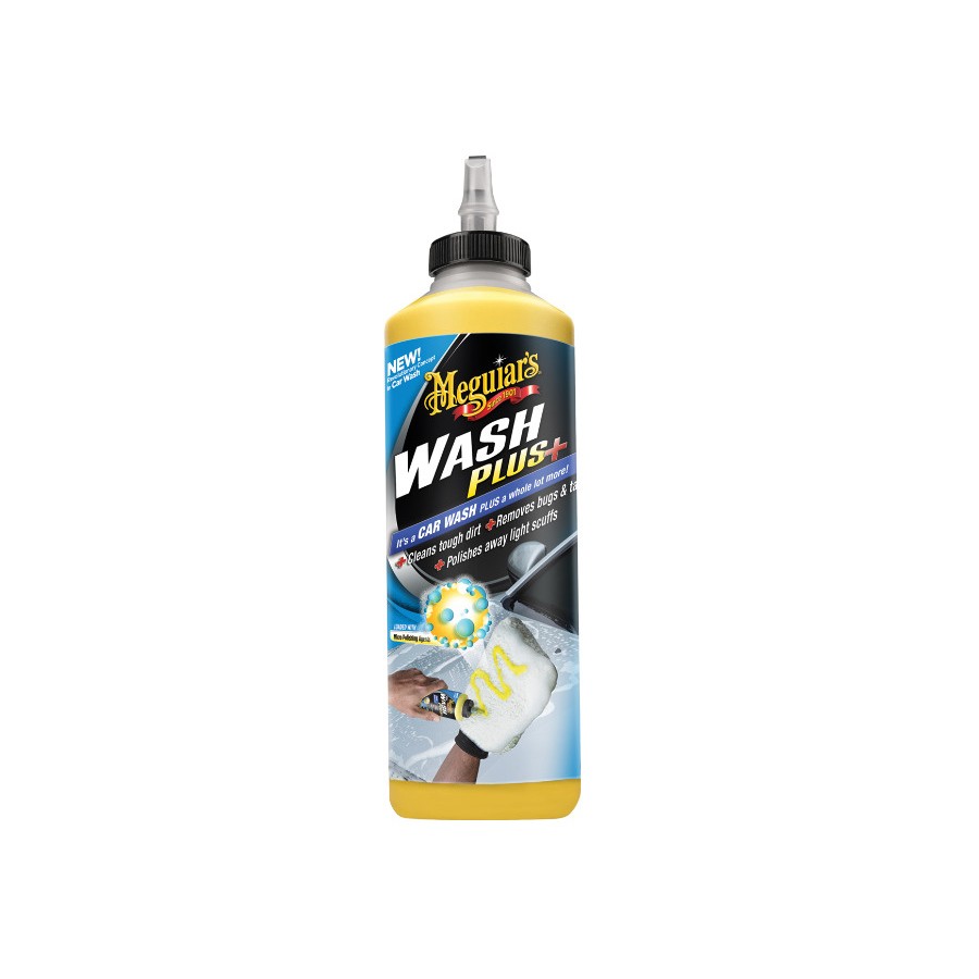 Meguiar's Wash Plus+ je špeciálnym, vysoko koncentrovaným šampónom, ktorý nielenže z povrchu karosérie odstraňuje bežné nečistoty, ale jeho unikátne zloženie dokáže veľmi účinne odstraňovať tiež zaschnutý vtáčí trus, hmyz alebo asfaltové bodky. Leštiace prímesi navyše zvládnu z laku odstrániť drobné otery, akými sú napríklad prenos farby pri ľahkom otretí iného auta pri parkovaní, alebo otery pri ľahkom mechanickom kontakte s ďalšími predmetmi. Súčasne posilní aj jeho lesk. Jediným krokom tak zbavíte svoje auto silných nečistôt a podporíte jeho lesk. Obsahom jedného balenia umyjete pri správnom použití okolo 20 bežných osobných áut.