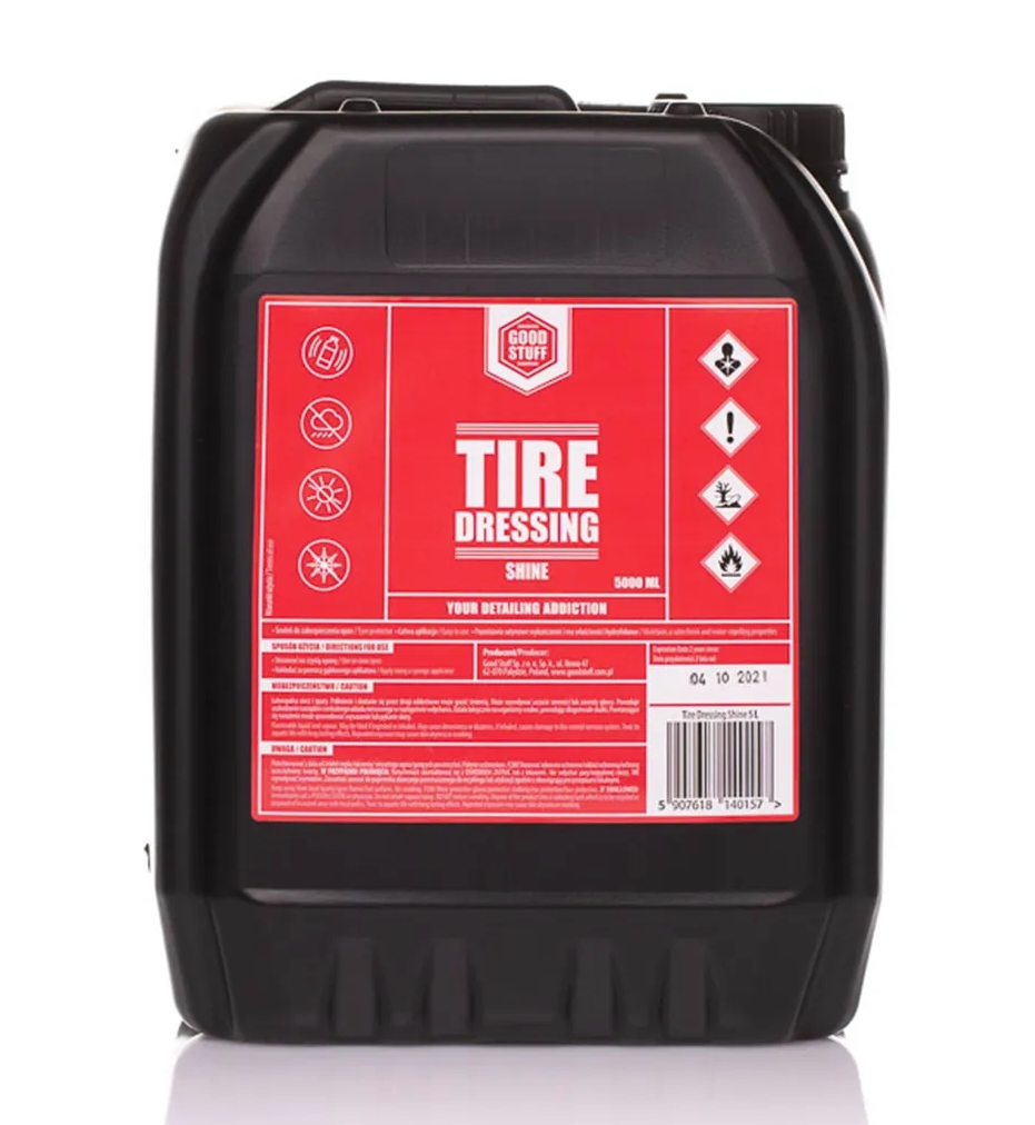 Good Stuff Tire Dressing Shine ponúka lesklý efekt pneumatík, čo poskytuje pneumatikám nový vzhľad s pridaným leskom. Má tekutú konzistenciu, ktorá uľahčuje aplikáciu. Stmavuje pneumatiky a dodáva im hydrofóbny efekt. Medzi výhody patrí možnosť aplikácie na mokré pneumatiky, ochrana proti UV žiareniu a životnosť až 2 – 3 týždne. Odporúčame aplikovať pomocou špeciálneho aplikátora na pneumatiky.