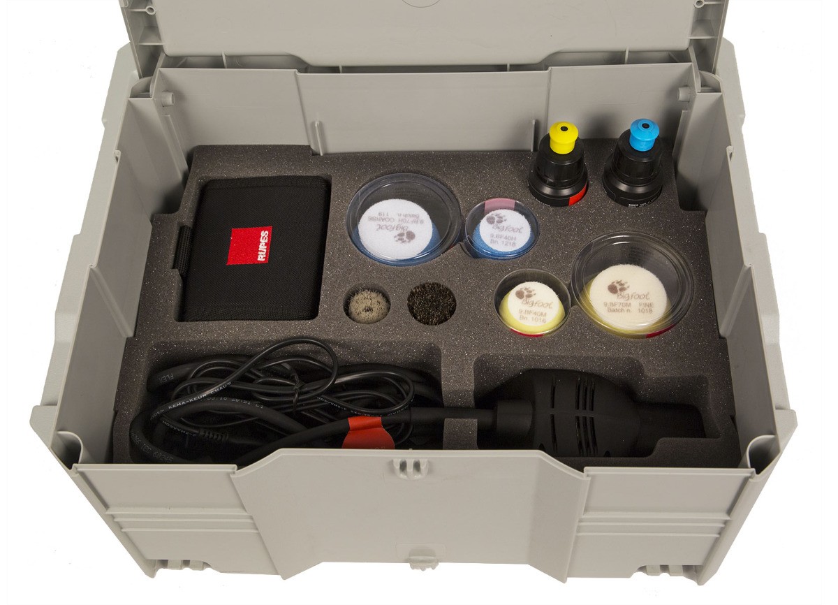 Nano leštička s krátkym krkom, kompletná sada s príslušenstvom v boxe RUPES Systainer T-Loc Case. Nano leštička RUPES iBrid ponúka vďaka vymeniteľným hlavám celkom tri typy pohybu: