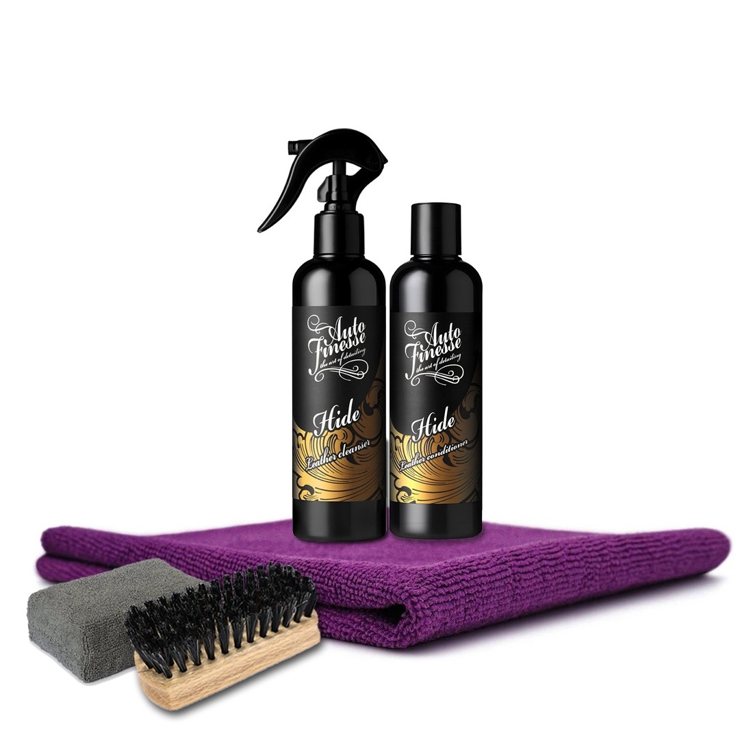 Vysoko kvalitná malá sada na čistenie a vyživenie kože v automobile. Obsahuje účinný, ale šetrný čistič kože, vyživenie kože s matným efektom od Auto Finesse, vrátane kompletného príslušenstva, ako je kefa, utierka či aplikátor. Auto Finesse Hide Leather Cleanser je hodnotený ako jeden z najlepších čističov kože na trhu. Je založený na báze glycerínu a je špeciálne vyvážený tak, aby bezpečne odstránil znečistenie zo všetkých typov kožených povrchov. Hide Leather Cleanser rýchlo preniká do pórov materiálu, pôsobí na hlboko "zažraté" nečistoty, škvrny a mastnotu. Dokonca odstráni aj škvrny spôsobené modrými džínsami alebo šmuhy od topánok. Je úplne bezpečný pre akékoľvek kožené povrchy.