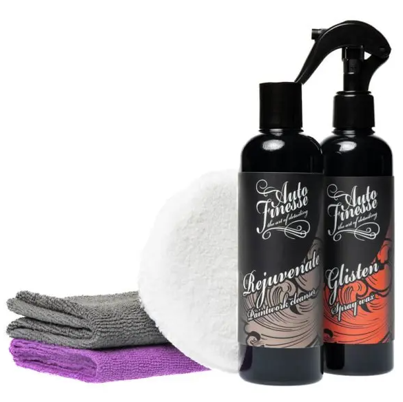 Malá sada na rýchlo navoskovaný lak nového auta obsahuje čistiace leštidlo Auto Finesse Rejuvenate, rýchly vosk Auto Finesse Glisten, mikrovláknový aplikátor a dvojicou mikrovláknových utierok od nemeckého výrobcu The Collection.