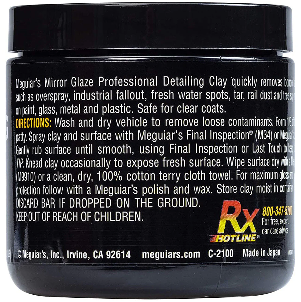 Rýchlo odstraňuje všetky naviazané kontaminanty, napr. vzduchom roznášanú hrdzu, asfalt, miazgu zo stromov a ďalšie nečistoty, ktoré nemožno odstrániť bežným umývaním. Obnovuje povrch hladký ako sklo. 100% neabrazívny - bezpečný pre použitie na všetkých typoch lakov. Pre lubrikáciu používajte M34 Final Inspection (prelakovateľné) alebo D155 Last Touch Spray Detailer nariedený v pomere 1:1 s vodou.