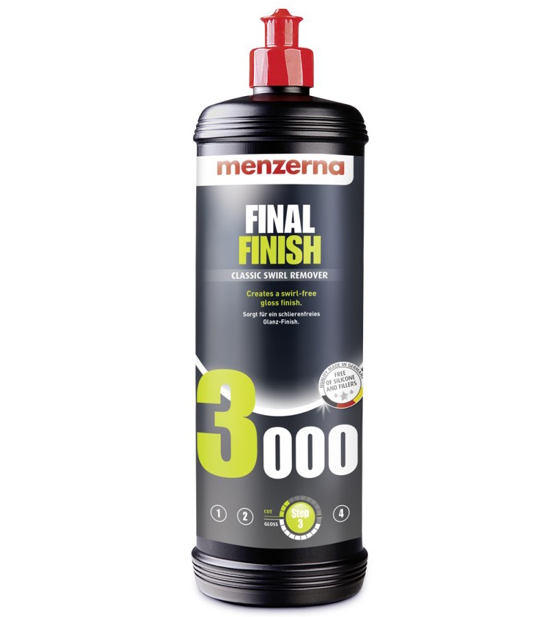 Menzerna Final Finish je ľahká dokončovacia leštiaca pasta, ktorá dodá povrchu laku vynikajúci lesk. Účinne odstraňuje malé chyby laku, ako sú jemné škrabance a hologramy. Odstraňuje zrnitosti 3000. Neobsahuje silikón. Minimalizácia prašnosti pri leštení strojom.