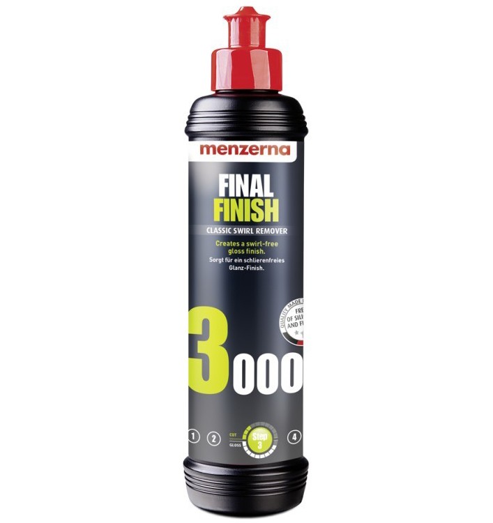 Menzerna Final Finish je ľahká dokončovacia leštiaca pasta, ktorá dodá povrchu laku vynikajúci lesk. Účinne odstraňuje malé chyby laku, ako sú jemné škrabance a hologramy. Odstraňuje zrnitosti 3000. Neobsahuje silikón. Minimalizácia prašnosti pri leštení strojom.