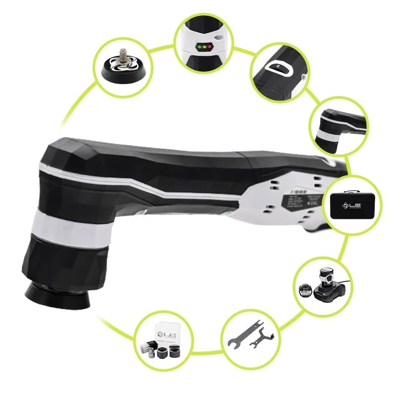Malá leštička vhodná na leštenie úzkych plôch alebo miest, ktoré sú horšie dostupné. Pri väčšine vozidiel sú krivky karosérie výrazne členité a zložité. S klasickou leštičkou sa na mnoho miest nedá dostať, a preto je tu táto AKU leštička od Liquid Elements. Navyše ju môžete použiť aj v interiéri, napríklad na interiérový dekór lakovaný do čierneho klavírneho lesku, lakované lúče alukol, kľučky dverí, spätné zrkadlá a mnoho ďalších malých dielov. Leštičku A1000 je možné nastaviť na rotačný alebo orbitálny pohyb. LED indikátor stavu nabitia batérie informuje o nutnosti výmeny batérie. V balení sú k leštičke 2 batérie, takže pokiaľ budete mať obidve nabité, stačí vymeniť a pokračovať v práci. Na korekciu laku sa odporúča použiť rotačný spôsob a na finálne doleštenie potom zvoliť orbitálny pohyb na elimináciu prípadných hologramov. Na leštičku by pri práci nemal byť vyvíjaný tlak presahujúci hodnotu 0,5 kg.
