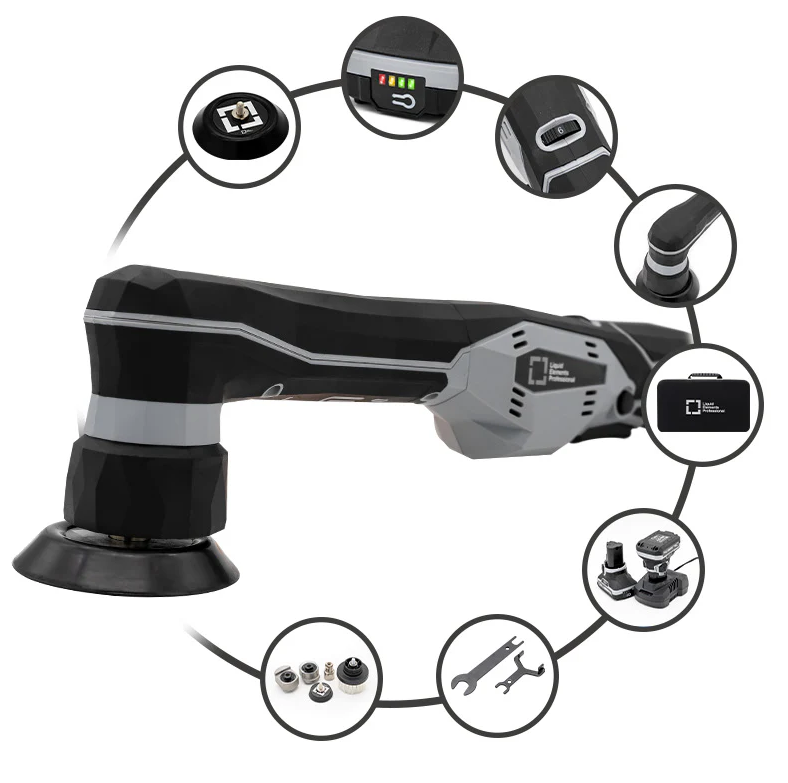 Leštička A2000 Pro predstavuje prevratný skok v oblasti batériových leštiacich strojov. Jej ergonomický tvar umožňuje vynikajúcu manipuláciu, zatiaľ čo konštantná elektronika zaisťuje stabilný krútiaci moment a otáčky. Liquid Elements ponúka s A2000 Pro prvotriedne riešenie v segmente profesionálnych batériových leštiacich strojov. Prísne a nepretržité kontroly kvality navyše zaisťujú vysokú spoľahlivosť. Vďaka priloženým nadstavcom pre 3mm, 8mm a 10mm excentrický mechanizmus, a tiež otočnému mechanizmu je A2000 Pro veľmi univerzálny. Aj na ťažko prístupných miestach je možné bez problémov pracovať. Tento leštiaci stroj je nepostrádateľným nástrojom pre všetkých profesionálov v príprave vozidiel a ponúka maximálnu efektivitu a výkon pri leštení. Vďaka svojej kompaktnej veľkosti dizajnu napájanému batériou je A2000 Pro ideálny na prepravu a spontánne použitie. Druhá batéria, ktorá je súčasťou dodávky, umožňuje takmer nepretržitú prácu. Integrovaný LED displej včas signalizuje, kedy je potrebné nabiť batériu, aby nedošlo k prerušeniu práce. A2000 Pro je ideálny na prácu na všetkých lakovaných povrchoch na vozidlách.