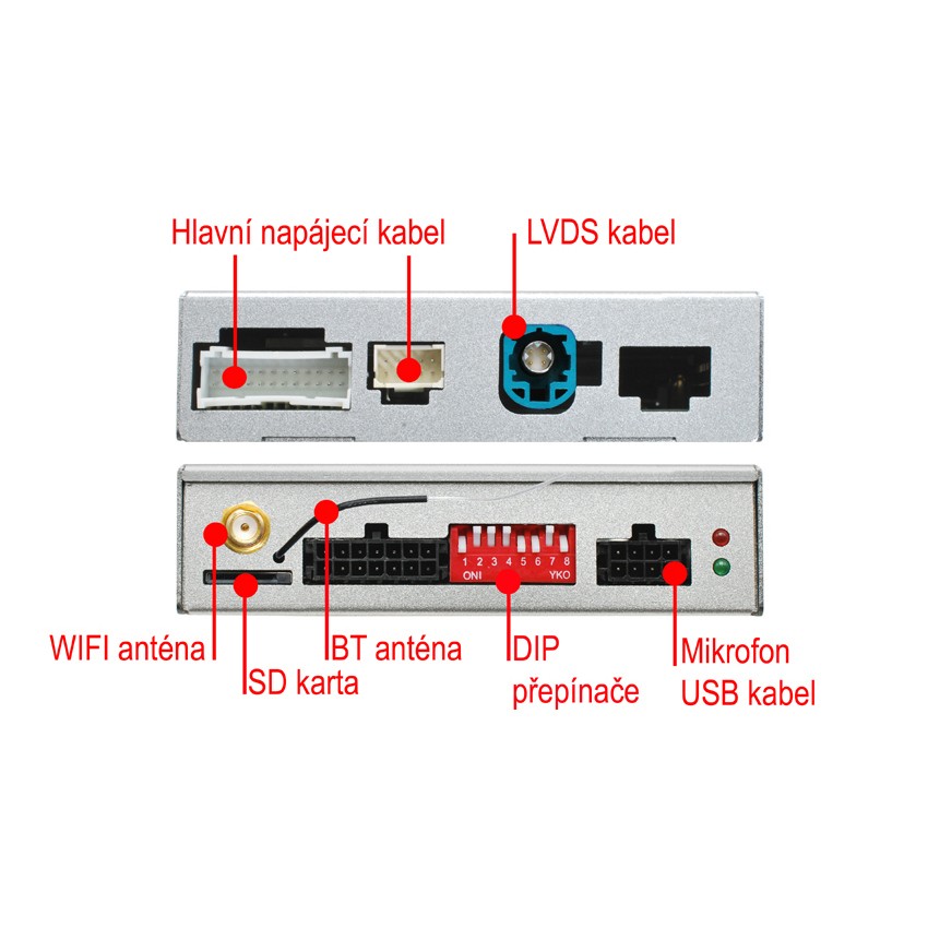 - Modul umožňuje Android Auto a zrkadlenie obrazovky po pripojení káblom.