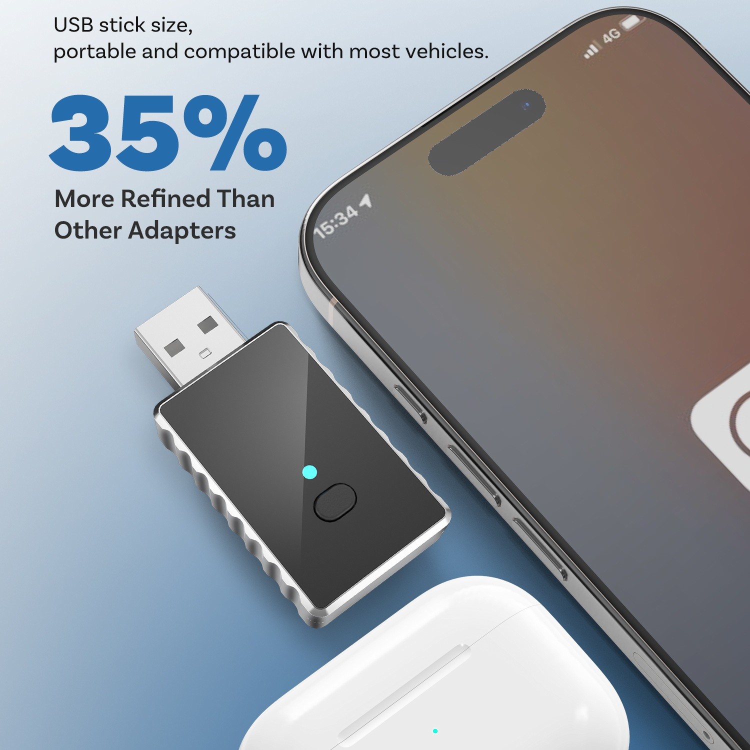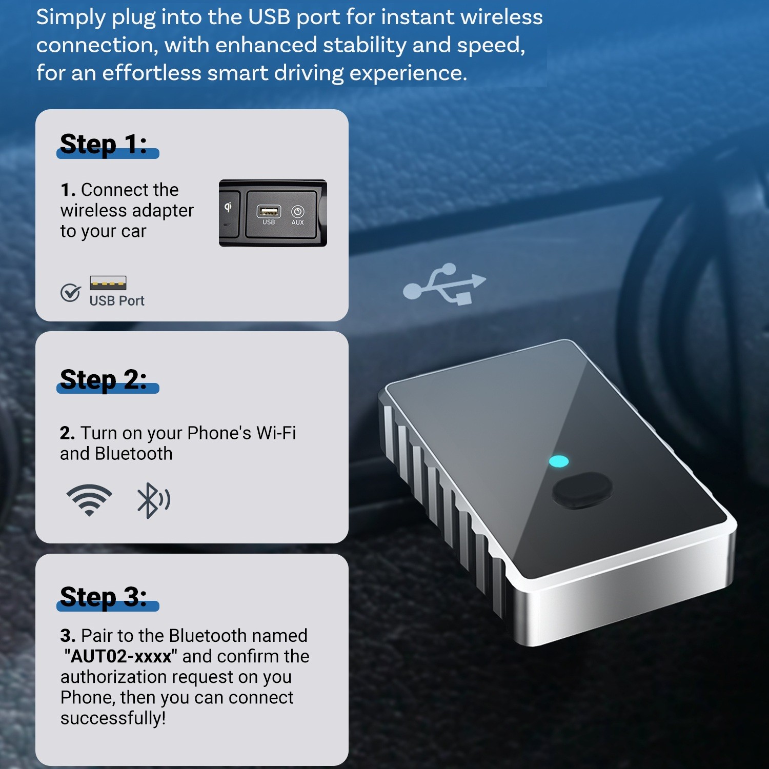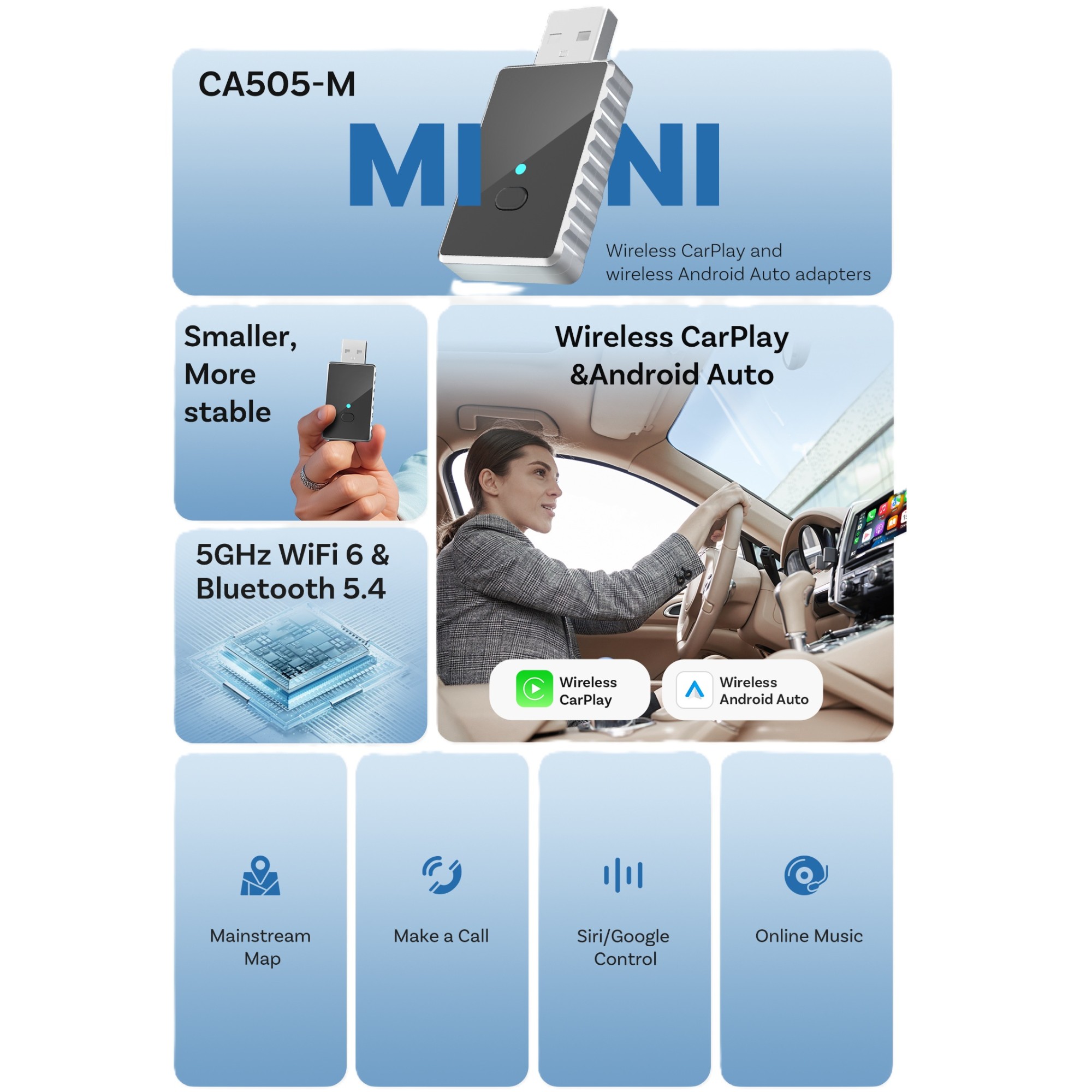 Univerzálny miniatúrny adaptér pre bezdrôtové pripojenie Apple CarPlay / Android Auto. Určený pre vozidlá s jednotkou Apple CarPlay/Android Auto s káblovým pripojením. Ovládanie podporovaných aplikácií zostáva zachované dotykovým displejom, tlačidlami na volante alebo iným spôsobom. Jednoduché zapojenie modulu – do USB zásuvky vozidla určeného pre telefón. Telefón sa pripája k jednotke vozidla cez modul automaticky (po prvotnom BT spárovaní). S miniatúrnym modulom CA505 už nie je potrebné pripájať telefón do USB vo vozidle. Pripojenie s Apple CarPlay / AndroidAuto jednotkou vozidla prebehne automaticky cez Wi‑Fi vždy po zapnutí zapaľovania. Modul zostáva trvalo pripojený do USB zásuvky vozidla namiesto telefónu a môžete si užívať slobodu bez kábla.