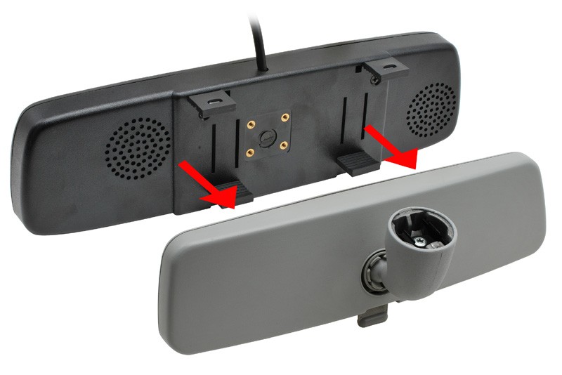 Monitor umiestnený v spätnom zrkadle slúži na zobrazenie obrazu z parkovacej kamery alebo na zobrazenie obrazu DVD prehrávača. Zrkadlo je umiestnené na originálnom zrkadle automobilu alebo je umiestnené na čelnom skle na mieste originálneho zrkadla - špeciálny držiak vyberte zo súvisiacich produktov podľa typu automobilu a pätky umiestnené na čelnom skle. Jednoduchá inštalácia bez zásahu do interiéru automobilu. Obraz z parkovacej kamery sa automaticky aktivuje po zaradení spiatočky alebo pripojení video signálu.