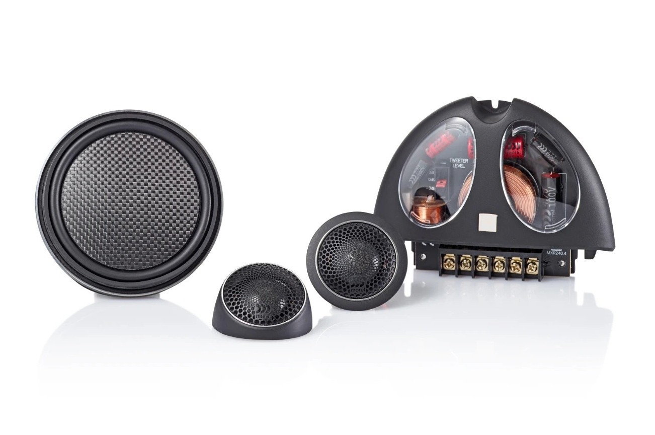 | Typy reproduktorov Koaxiálne reproduktory: Koaxiálne reproduktory sa vyznačujú konštrukciou tzv. Všetko v jednom. Výškový a stredobasový reproduktor sú v jednom koši. Výhodou je jednoduchšia montáž, ale vďaka spojeniu resp. blízkosti pásiem v jednom reproduktore, sa zvyčajne zníži kvalita zvuku. Spravidla uprostred stredobasového reproduktora, je výškový reproduktor, ktorého kmitacia cievka pracuje v druhej vzduchovej medzere spoločného magnatického obvodu. Trojpásmový koaxiálny reproduktor sa skladá zo stredobasového reproduktora, v predu na osobitnom nosníka je stredový reproduktor a samostatný výškový. Komponentné reproduktory: Komponentné reproduktory sa vyznačujú rozdelením na jednotlivé frekvenčné pásma, výškové + stredobasové + popr. basové pásmo. Jednotlivé reproduktory sa dajú umiestniť úplne oddelene, čo má za výsledok lepší zvukový aj akustický prejav. V drvivej väčšine prípadov komponentných reproduktorov je dodávaná aj externá výhybka, ktorá rozdeľuje výškové, stredové / stredobasové a u třípásma aj basové pásmo popr. umožňuje nastavenie decibelovej úrovne u výškového reproduktoru (napr. +2 dB, 0 dB, -2 dB), strmosti (napr. 6dB / okt. 12dB / okt.) či aktívne alebo bi-amp zapojenia. | Komponentné 2pásmové |