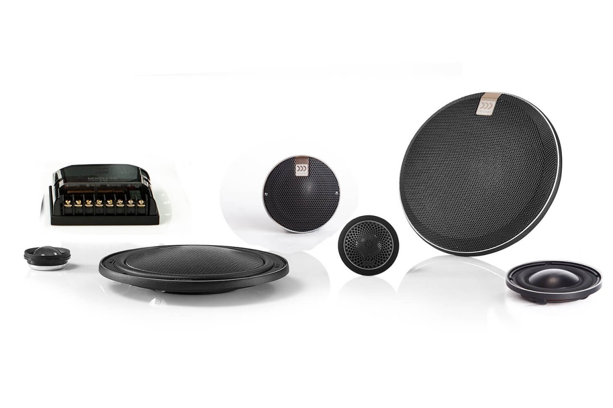 | Typy reproduktorov Koaxiálne reproduktory: Koaxiálne reproduktory sa vyznačujú konštrukciou tzv. Všetko v jednom. Výškový a stredobasový reproduktor sú v jednom koši. Výhodou je jednoduchšia montáž, ale vďaka spojeniu resp. blízkosti pásiem v jednom reproduktore, sa zvyčajne zníži kvalita zvuku. Spravidla uprostred stredobasového reproduktora, je výškový reproduktor, ktorého kmitacia cievka pracuje v druhej vzduchovej medzere spoločného magnatického obvodu. Trojpásmový koaxiálny reproduktor sa skladá zo stredobasového reproduktora, v predu na osobitnom nosníka je stredový reproduktor a samostatný výškový. Komponentné reproduktory: Komponentné reproduktory sa vyznačujú rozdelením na jednotlivé frekvenčné pásma, výškové + stredobasové + popr. basové pásmo. Jednotlivé reproduktory sa dajú umiestniť úplne oddelene, čo má za výsledok lepší zvukový aj akustický prejav. V drvivej väčšine prípadov komponentných reproduktorov je dodávaná aj externá výhybka, ktorá rozdeľuje výškové, stredové / stredobasové a u třípásma aj basové pásmo popr. umožňuje nastavenie decibelovej úrovne u výškového reproduktoru (napr. +2 dB, 0 dB, -2 dB), strmosti (napr. 6dB / okt. 12dB / okt.) či aktívne alebo bi-amp zapojenia. | Komponentné 3pásmové |