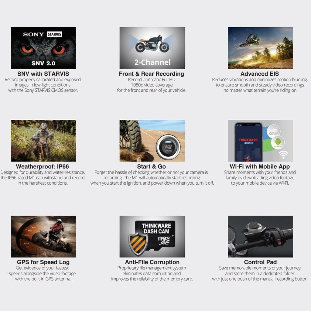 Športová kamera M1 využíva špičkovú elektronickú stabilizáciu obrazu pre plynulé a stabilné zábery v rozlíšení 1080p Full HD na prednej aj zadnej kamere. Robustné telo kamery je odolné voči poveternostným vplyvom s IP68 krytím, navrhnuté pre inštaláciu na motocykle, štvorkolky a iné vozidlá, jej umožňuje odolať akýmkoľvek podmienkam. Je vybavená užitočnými funkciami, ako je diaľkové ovládanie pre ukladanie nezabudnuteľných momentov a vstavané GPS a Wi-Fi umožňujúce rýchly a jednoduchý prístup k záznamom.
