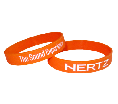 Oranžový, gumový náramok s logom Hertz a s loganom značky "The Sound Experience." Štýlový doplnok pre milovníkov značky Hertz.