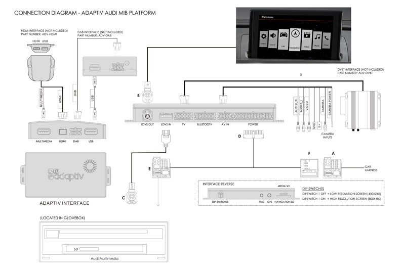 Adaptiv - elektronický modul, ktorý umožňuje rozšírenie existujúcich jednotiek s OEM monitorom o navigáciu, prehrávanie videa, vstup USB, iPhone, SD kartu, HDMI, AUX, pripojenie zadnej parkovacej kamery, DAB rádiového tunera alebo DVB-T televízie. Všetko je ovládané pomocou otočného ovládača Audi MMI.